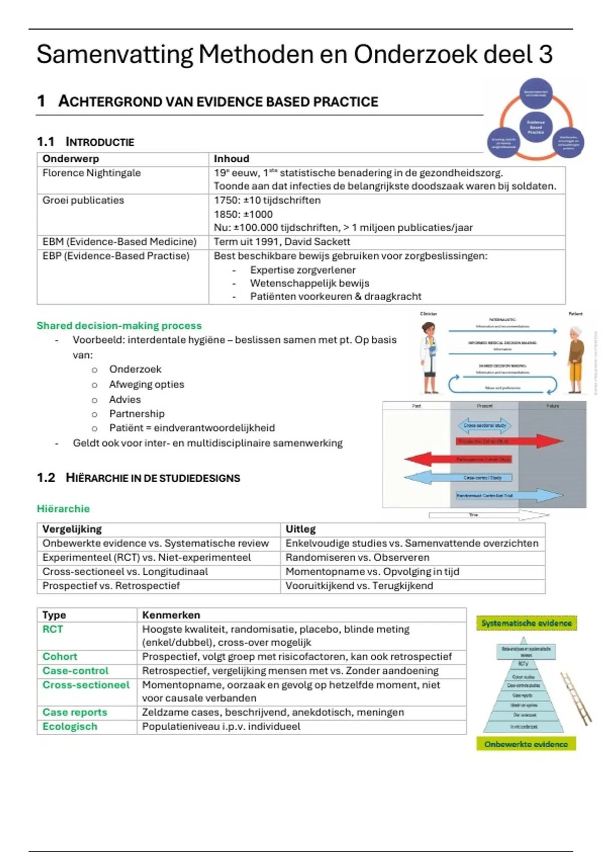 Uitgebreide samenvatting Methoden en Onderzoek deel 3, gericht op Evidence-Based Practice (EBP), studiedesigns, kritisch lezen, richtlijnen en toepassing in mondzorg, met PICO en tools voor dagelijkse praktijk. ​ Belangrijkste onderwerpen: EBP en studiedesigns: Hiërarchie (RCT > cohort > case-control), systematische reviews, meta-analyses (forest plots, I²-test, WMD), Cochrane-database en richtlijnontwikkeling (AGREE II-criteria). Kritisch beoordelen: Checklists voor validiteit (bias, confounding), relevantie (effectgrootte, precisie), toepasbaarheid (externe validiteit), diagnose (sensitiviteit/specificiteit, LR, ROC) en interventies (NNT, ARR). Zoeken en beoordelen: PICO-vragen, zoekstrategieën (MeSH, Boolean), kwaliteitslijsten (RCT, cohort), kwalitatief onderzoek (triangulatie, saturatie) en richtlijnen (niveaus bewijskracht). Statistiek en toepassing: Descriptieve/inferentiële tests (t-toets, ANOVA, chi²), SPSS-stappen, shared decision-making en portfolio-examenvragen.