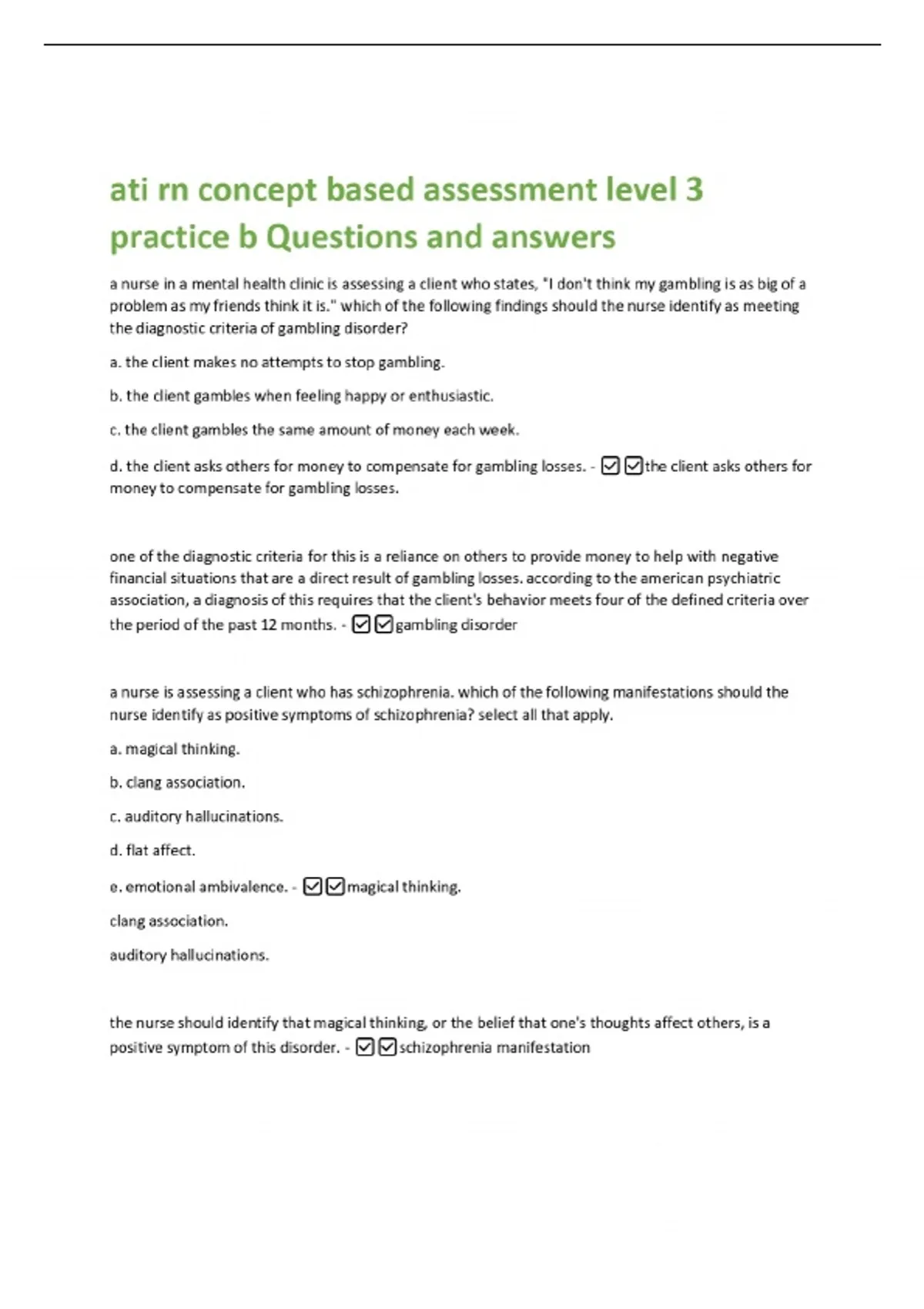ati rn concept based assessment level 3 practice b Questions and answers a nurse in a mental health clinic is assessing a client who states, "I don't think my gambling is as big of a problem as my friends think it is." which of the following findings should the nurse identify as meeting the diagnostic criteria of gambling disorder? a. the client makes no attempts to stop gambling. b. the client gambles when feeling happy or enthusiastic. c. the client gambles the same amount of money each week. d. the client asks others for money to compensate for gambling losses. - the client asks others for money to compensate for gambling losses. one of the diagnostic criteria for this is a reliance on others to provide money to help with negative financial situations that are a direct result of gambling losses. according to the american psychiatric association, a diagnosis of this requires that the client's behavior meets four of the defined criteria over the period of the past 12 months. - gambling disorder