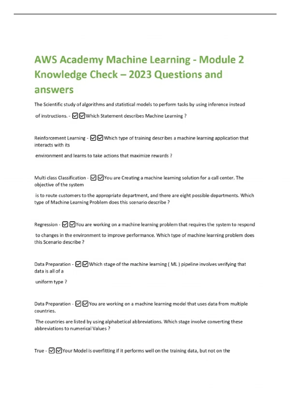AWS Academy Machine Learning - Module 2 Knowledge Check – 2023 Questions and answers The Scientific study of algorithms and statistical models to perform tasks by using inference instead of instructions. - Which Statement describes Machine Learning ? Reinforcement Learning - Which type of training describes a machine learning application that interacts with its environment and learns to take actions that maximize rewards ?
