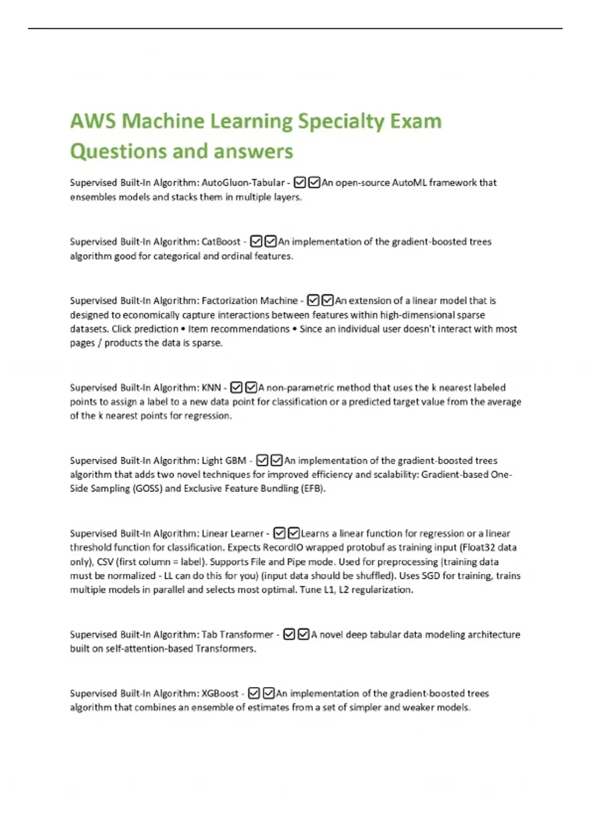AWS Machine Learning Specialty Exam Questions and answers Supervised Built-In Algorithm: AutoGluon-Tabular - An open-source AutoML framework that ensembles models and stacks them in multiple layers. Supervised Built-In Algorithm: CatBoost - An implementation of the gradient-boosted trees algorithm good for categorical and ordinal features. Supervised Built-In Algorithm: Factorization Machine - An extension of a linear model that is designed to economically capture interactions between features within high-dimensional sparse datasets. Click prediction • Item recommendations • Since an individual user doesn't interact with most pages / products the data is sparse.