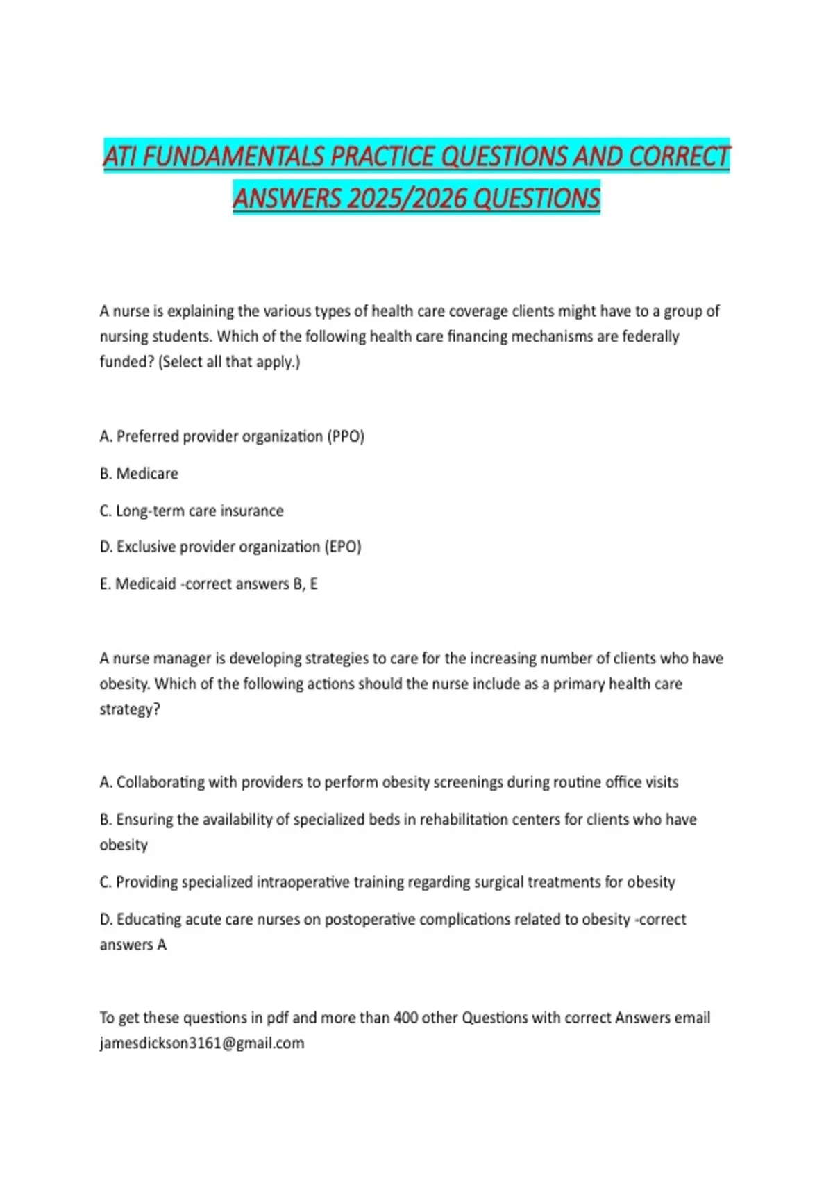 To get these ques ons in pdf and more than 400 other Ques ons with correct Answers email