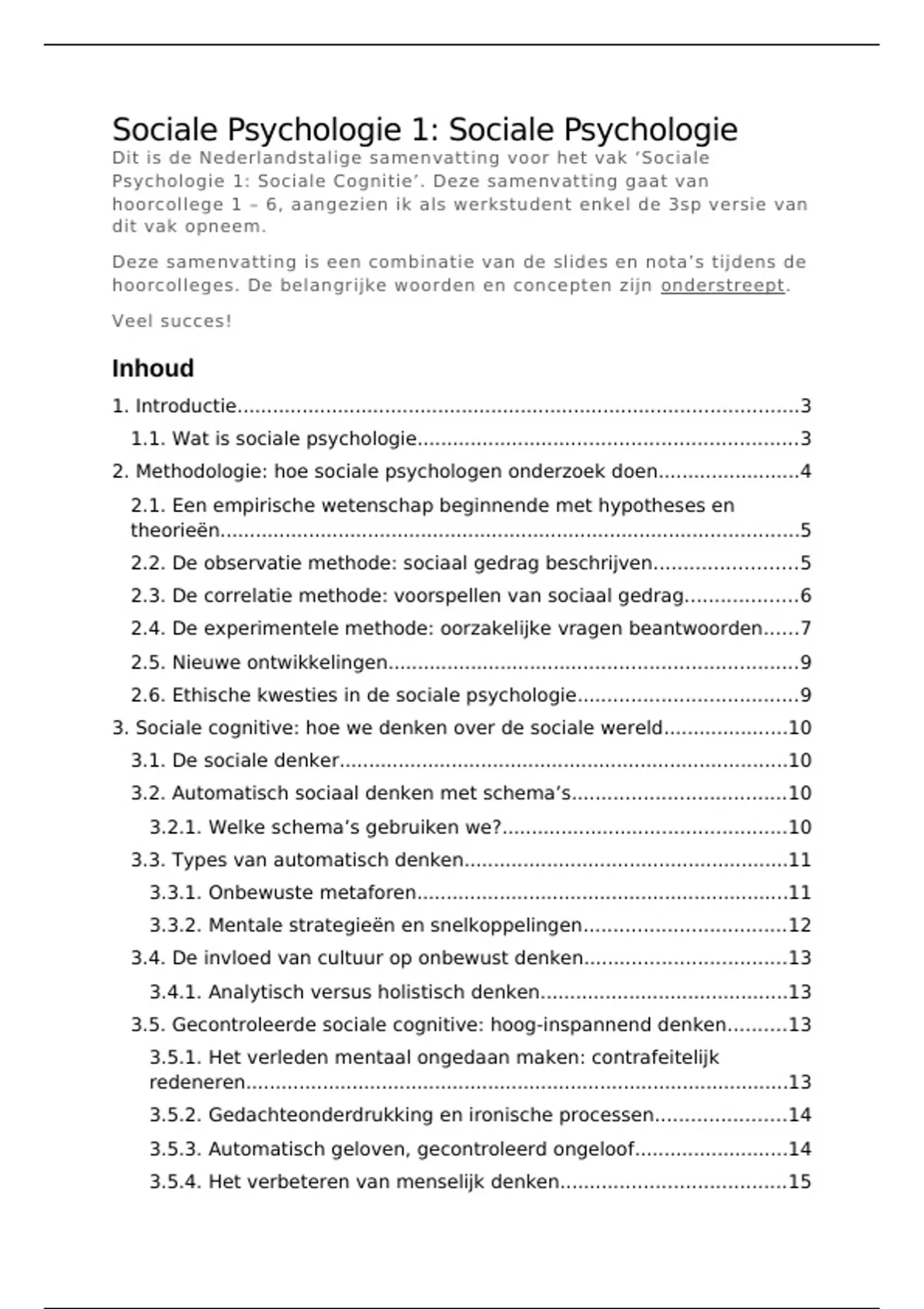 Samenvatting van het vak Sociale Psychologie 1: Sociale Cognitie aan de VUB. Deze samenvatting is in het Nederlands, er is ook een Engelstalige beschikbaar op mijn profiel (slides zijn in het Engels) Deze samenvatting is de 3 studiepunten versie, dus gaat van hoorcollege 1 tot 6 1018719AER or 1018718AEW voor werkstudenten