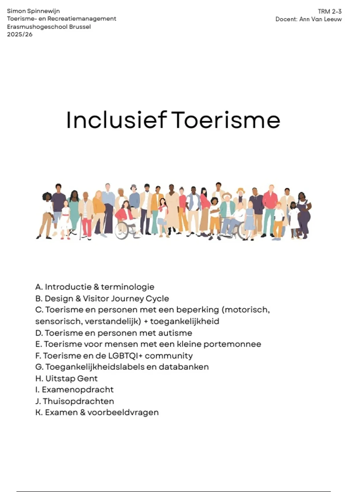 Samenvatting van het keuzevak "Inclusief Toerisme", dat gegeven wordt in het 2e of 3e jaar in de opleiding Toerisme- en Recreatiemanagement aan de Erasmushogeschool Brussel.