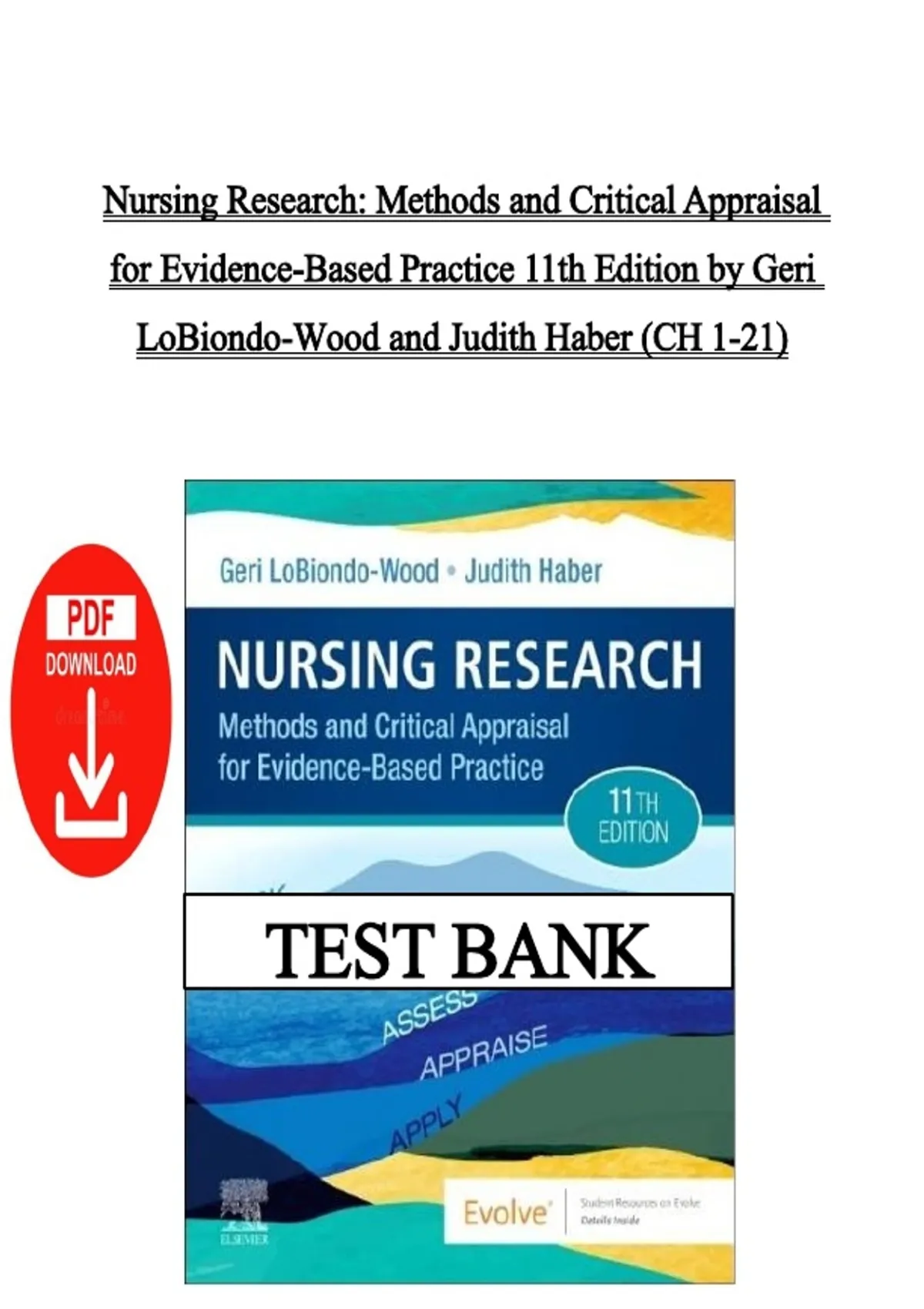 Test Bank – Nursing Research Methods and Critical Appraisal for Evidence-Based Practice, 11th Edition | LoBiondo-Wood & Haber | Chapters 1–21 | Latest Edition Prepare to excel in nursing research, evidence-based practice, and critical appraisal coursework with this complete test bank PDF for Nursing Research Methods and Critical Appraisal for Evidence-Based Practice, 11th Edition by Geri LoBiondo-Wood & Judith Haber. This Chapters 1–21 resource delivers extensive exam-style practice questions with verified answers and rationales designed to help students master research design, data analysis, evidence appraisal, and application of findings in clinical practice. Topics Covered (Aligned to Chapters 1–21): Introduction to Nursing Research & Evidence-Based Practice Historical & Philosophical Foundations of Research Ethical Issues in Nursing Research Quantitative Research Designs & Measurement Qualitative Research Methods & Naturalistic Inquiry Sampling Strategies & Sample Size Considerations Data Collection Techniques & Instrumentation Validity, Reliability & Measurement Error Descriptive & Inferential Statistics Basics Hypothesis Testing & Data Interpretation Research Critique & Critical Appraisal Frameworks Systematic Reviews, Meta-Analysis & Evidence Synthesis Translational Research & Implementation Science Evaluating Clinical Practice Guidelines Applying Evidence to Nursing Practice & Policy Nursing Research Methods test bank PDF, LoBiondo-Wood Haber research & EBP 11th Edition, evidence-based practice practice questions, nursing statistics and research design exam prep, qualitative & quantitative research review, instant download nursing test bank, research critique study guide