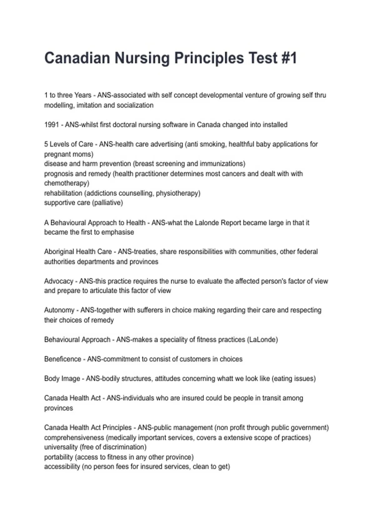Canadian Nursing Principles Test #1