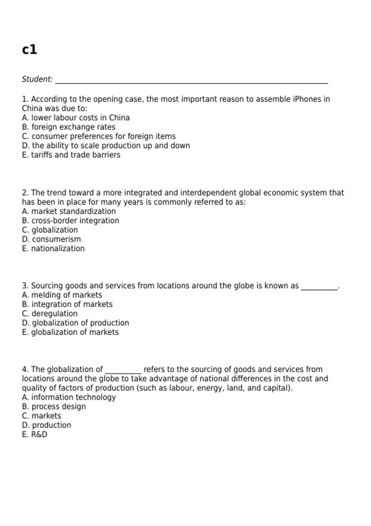 4. The globalization of __________ refers to the sourcing of goods and services from