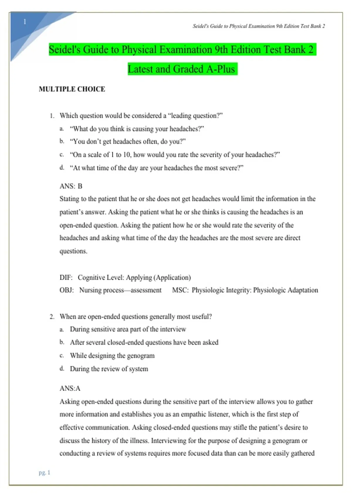 Seidel's Guide to Physical Examination 9th Edition Test Bank 2 Latest and Graded A-Plus