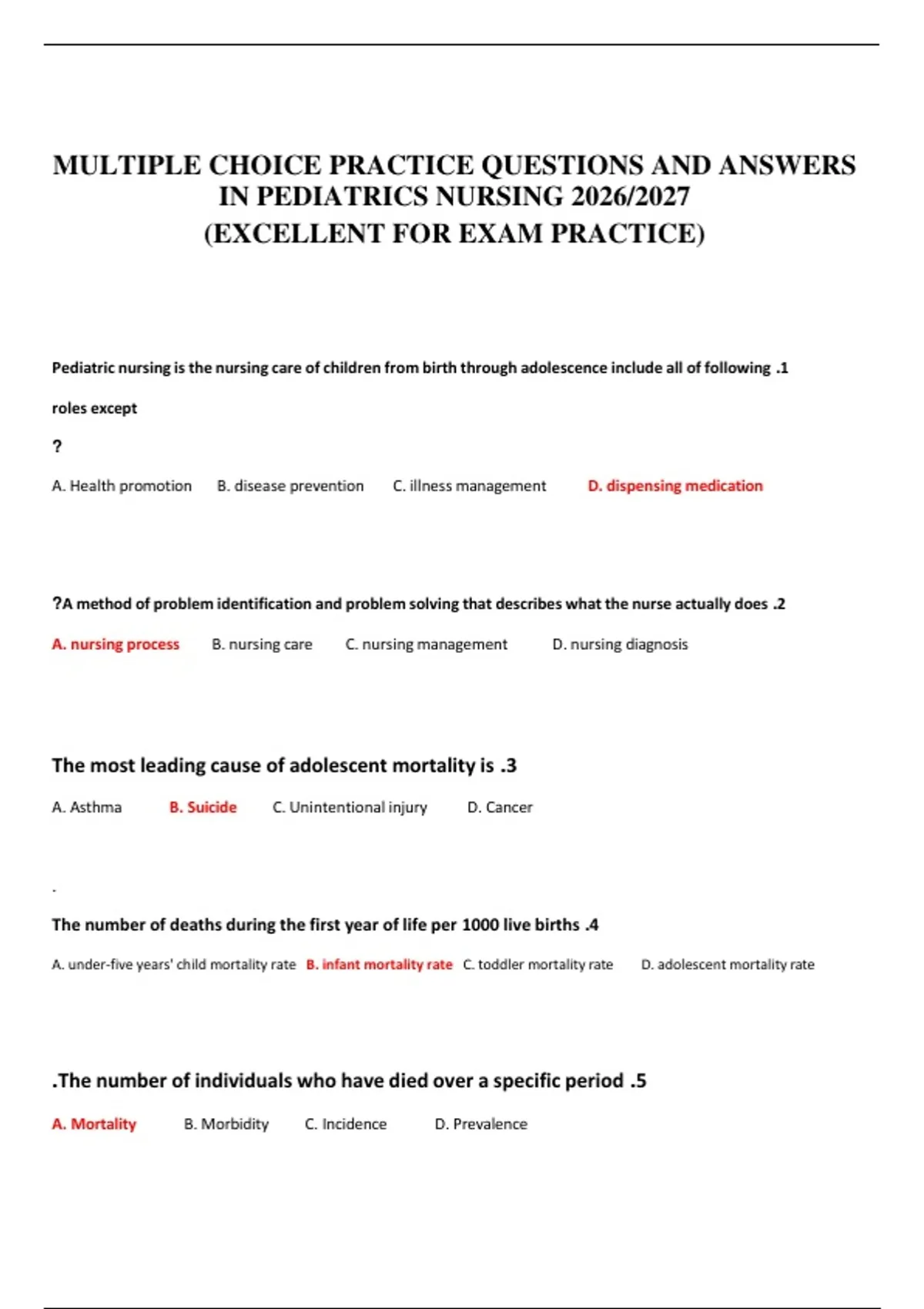 MULTIPLE CHOICE PRACTICE QUESTIONS AND ANSWERS IN PEDIATRICS NURSING 2026/2027 (EXCELLENT FOR EXAM PRACTICE)