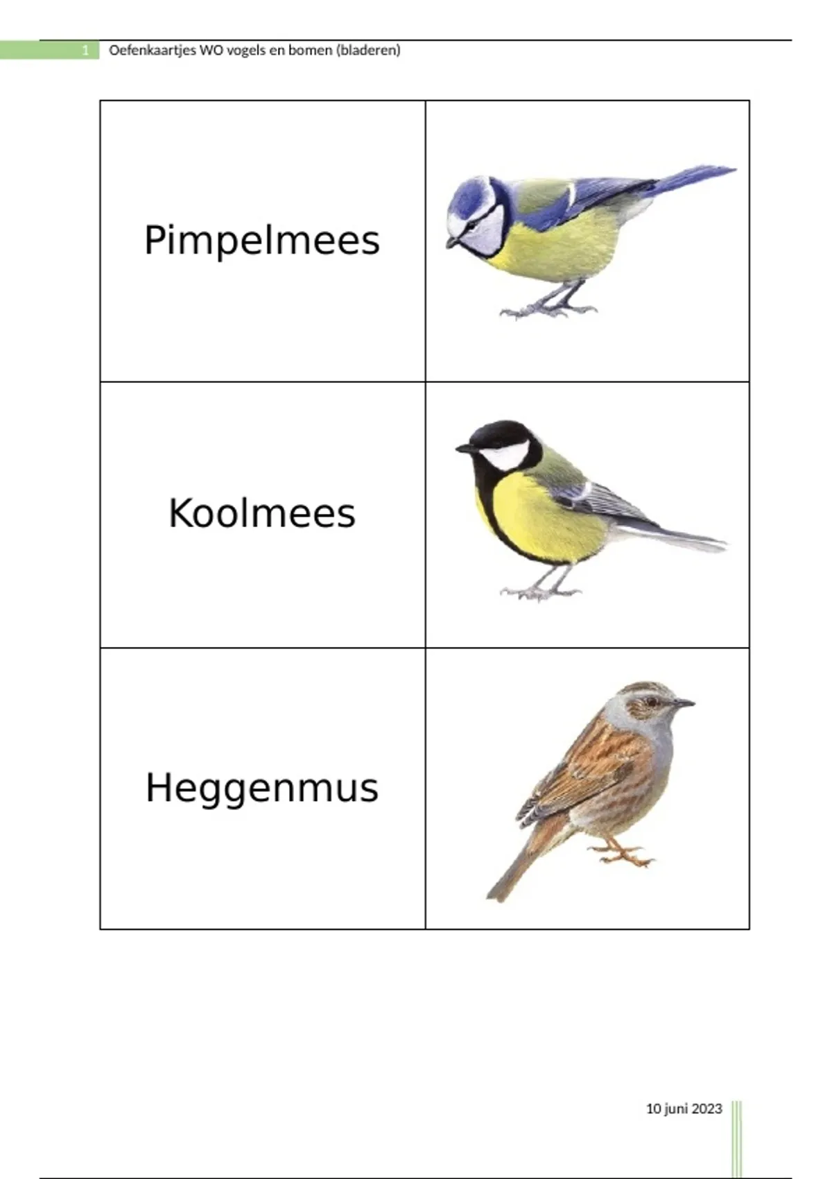 In het eerste jaar van de lerarenopleiding zal je waarschijnlijk enkele blad- en vogelnamen vanbuiten moeten leren. In dit document vind je duidelijke prenten en de bijhorende namen terug als flashcards om deze in te oefenen. Oefen digitaal of print de papieren af, knip ze uit per rij (prent en naam staan naast elkaar) en plak ze met de witte kant tegen elkaar. Voorgestelde oefenmethode: werk in 3 rondes. In ronde 1 oefen je alle kaartjes. Je maakt tijdens het oefenen 3 stapels: gekend, moeilijk en fout. Tijdens ronde 2 oefen je de kaartjes die moeilijk en fout waren nog een keer. Je legt de kaartjes die moeilijk waren in ronde 1 nu of op de gekend stapel of op de fout stapel. De kaartjes die in ronde 1 fout waren leg je ook nu weer bij fout, ook als ze juist zijn! In ronde 3 herhaal je alle kaartjes van de foutstapel, dat zijn degene waarmee je het die dag nog het moeilijkste had. Doe dat elke dag 10 minuutjes en je kent het in no time. Succes!