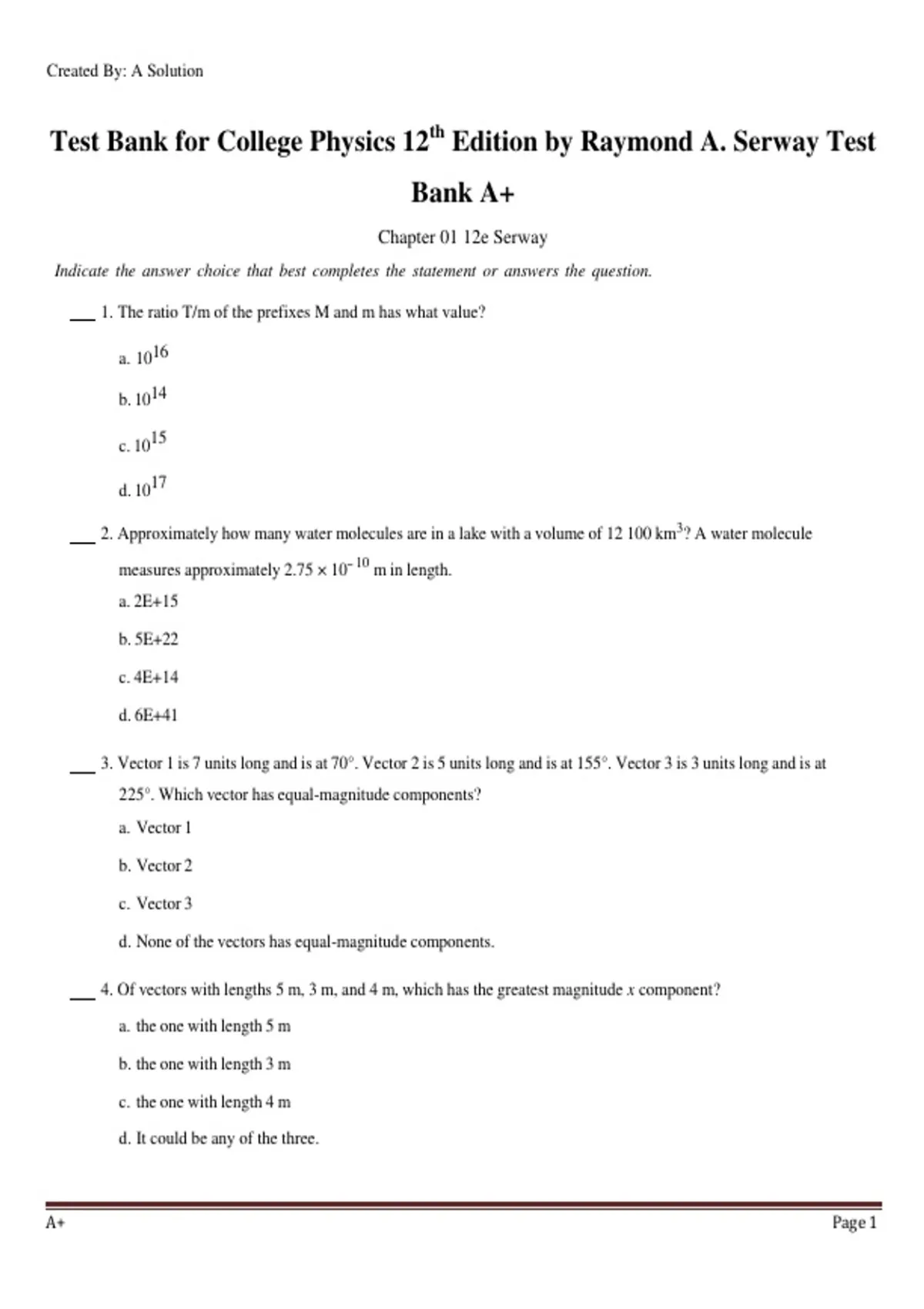 Testbank für College Physics, 12. Auflage von Raymond A. Serway: Alle Kapitel,
