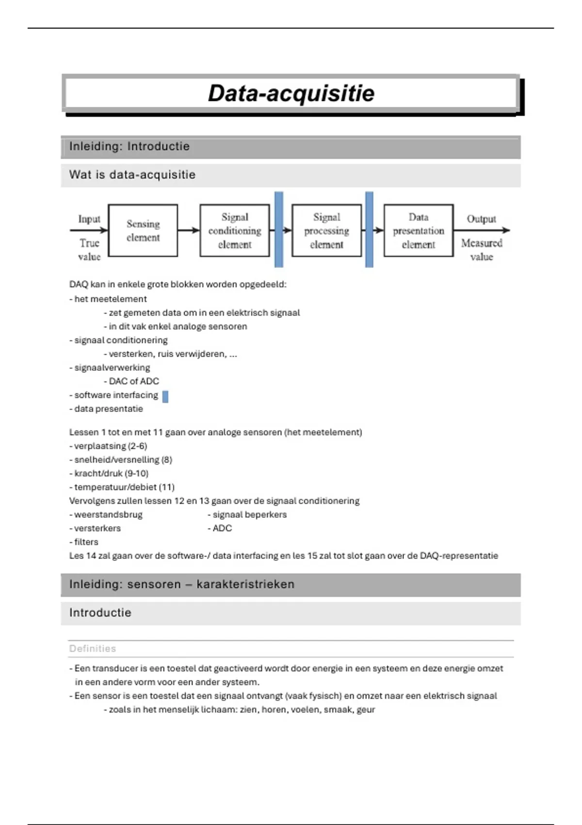 Een samenvatting voor het vak in bach 2 industrieel ingenieur aan KUL. In de samenvatting vind je een uitgebreide beschrijving van alle sensoren: verplaatsingssensoren, snelheidssensoren, druk sensoren, optische sensoren, versnellingssensoren, krachtsensoren, MEMS, .... Ook zal je een uitgebreide uitleg en voorbeelden krijgen over alles omtrent signalen: ADC, DAC, sampling, soorten, data interface, .... Verder vindt je in het document allerlei karakteristieken en afbeelding om het leren van dit vak gemakkelijker te maken. Ik ben op dit vak geslaagd aan de hand van deze samenvatting.