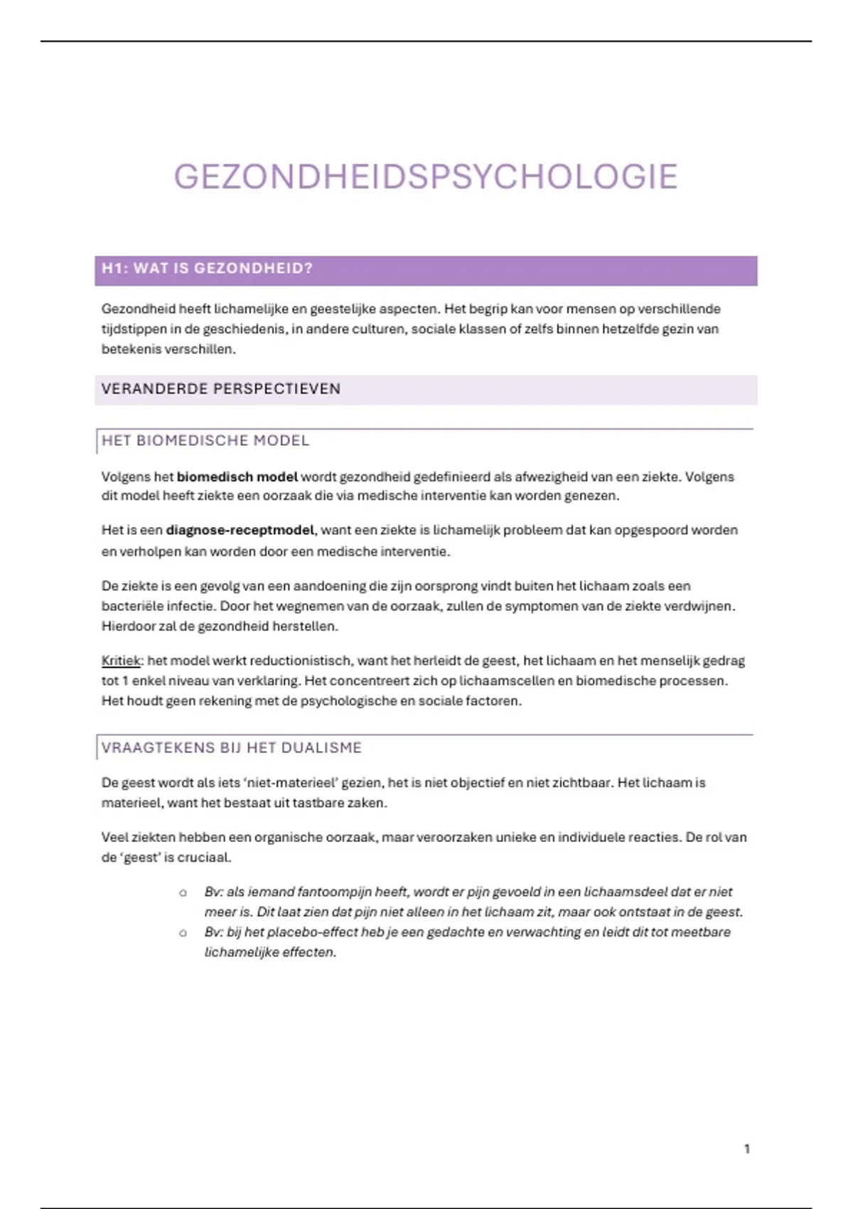 Dit is een samenvatting van het vak gezondheidspsychologie dat gegeven wordt in de richting toegepaste psychologie aan Artevelde (eerste jaar). Het is een volledige samenvatting die zowel informatie uit het boek + de slides + de leerpaden bevat. Alle hoofdstukken zijn er in verwerkt.