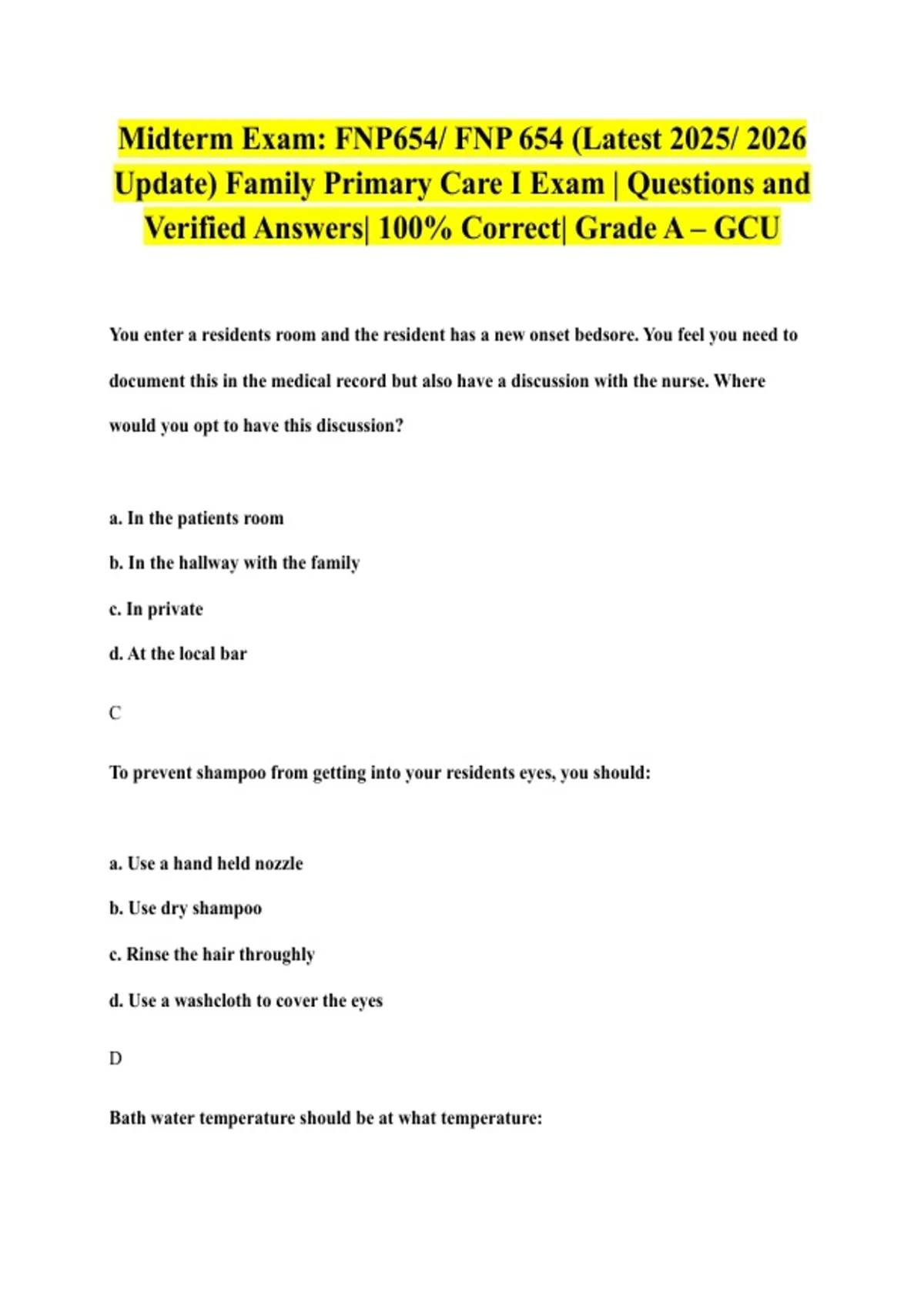 Midterm Exam: FNP654/ FNP 654 (Latest 2025/ 2026 Update) Family Primary Care I Exam | Questions and Verified Answers| 100% Correct| Grade A – GCU