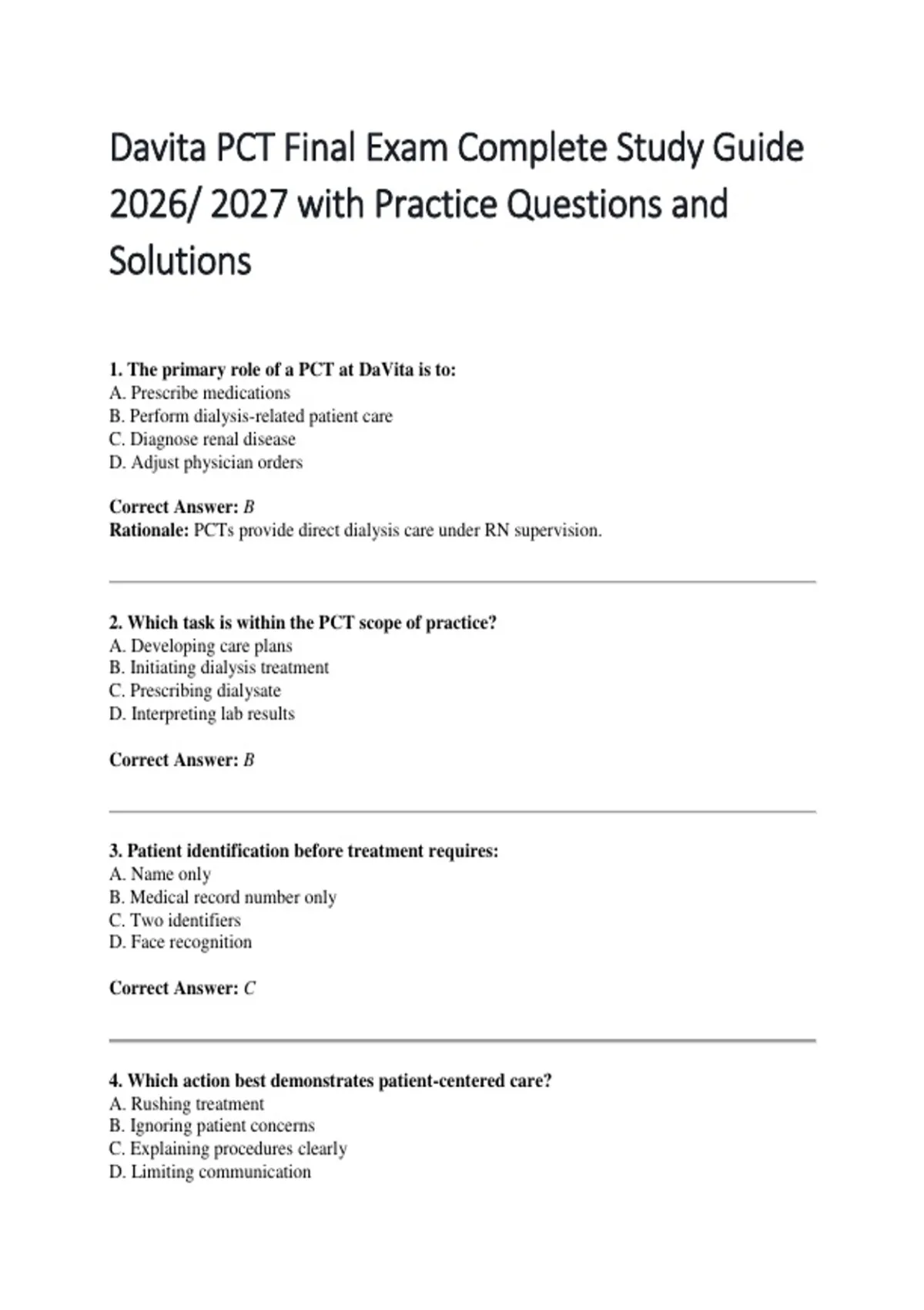 Davita PCT Final Exam Complete Study Guide 2026/ 2027 with Practice Questions and Solutions