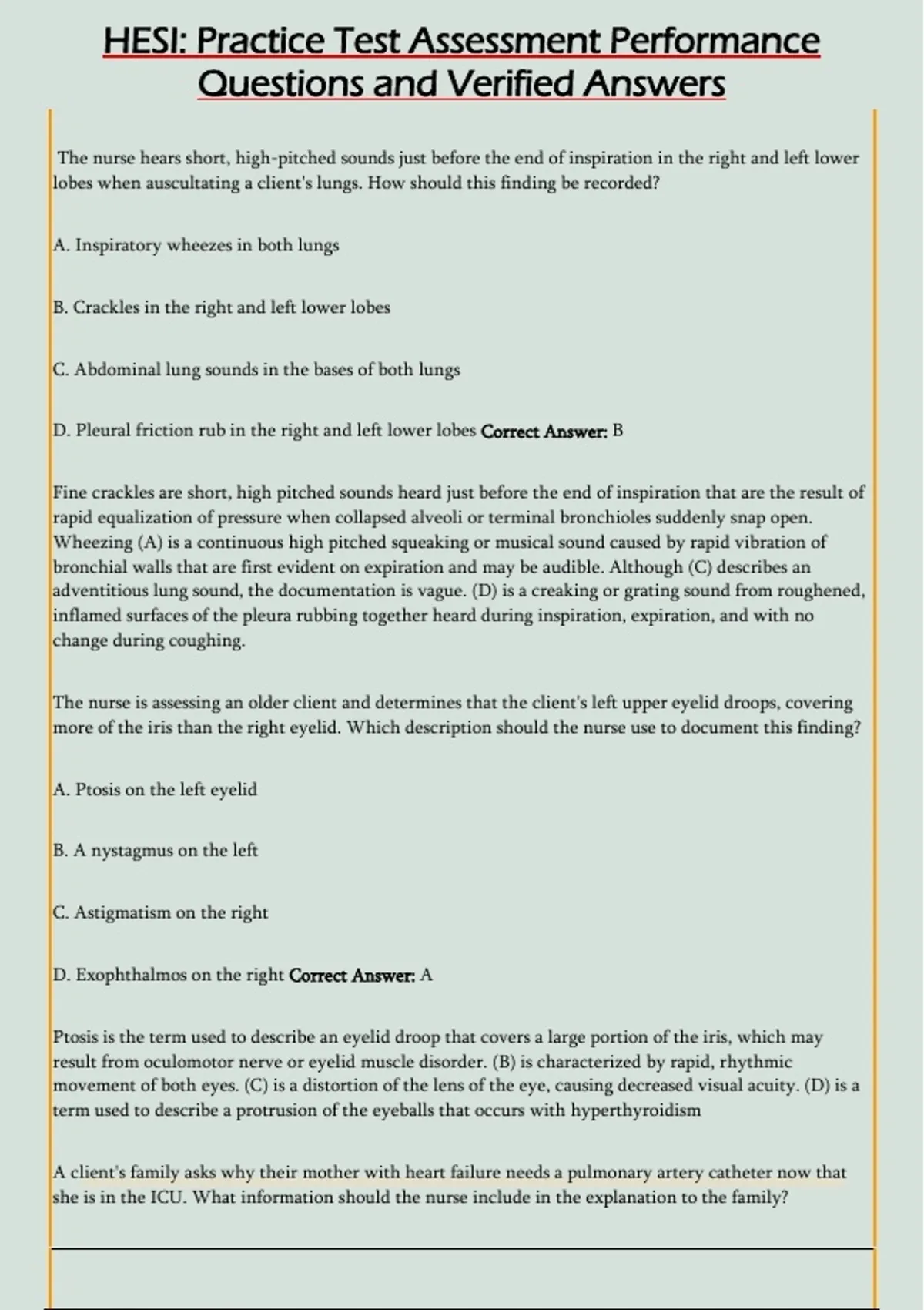 HESI: Practice Test Assessment Performance Questions and Verified Answers