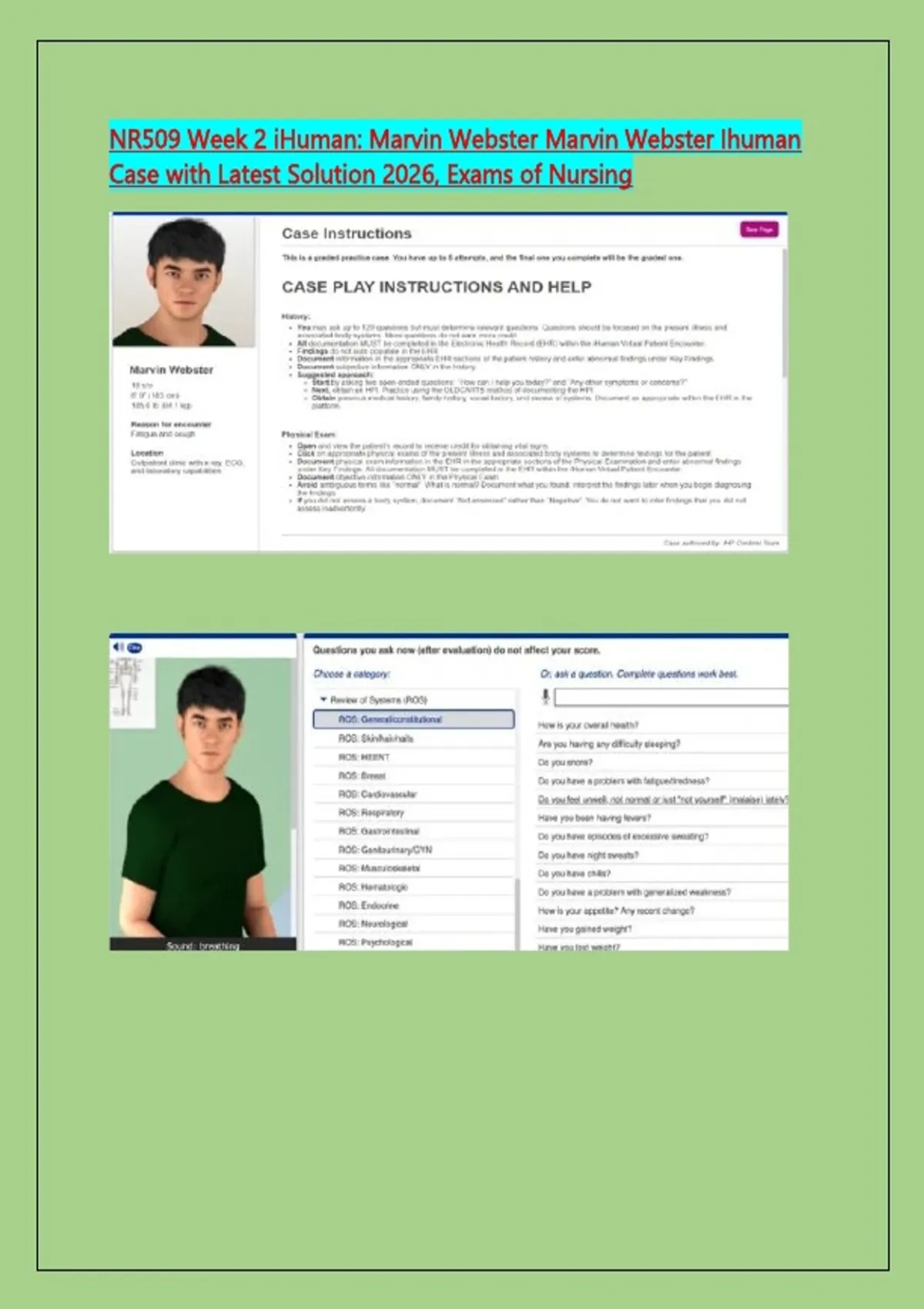 NR509 Week 2 iHuman: Marvin Webster Marvin Webster Ihuman Case with Latest Solution 2026, Exams of Nursing