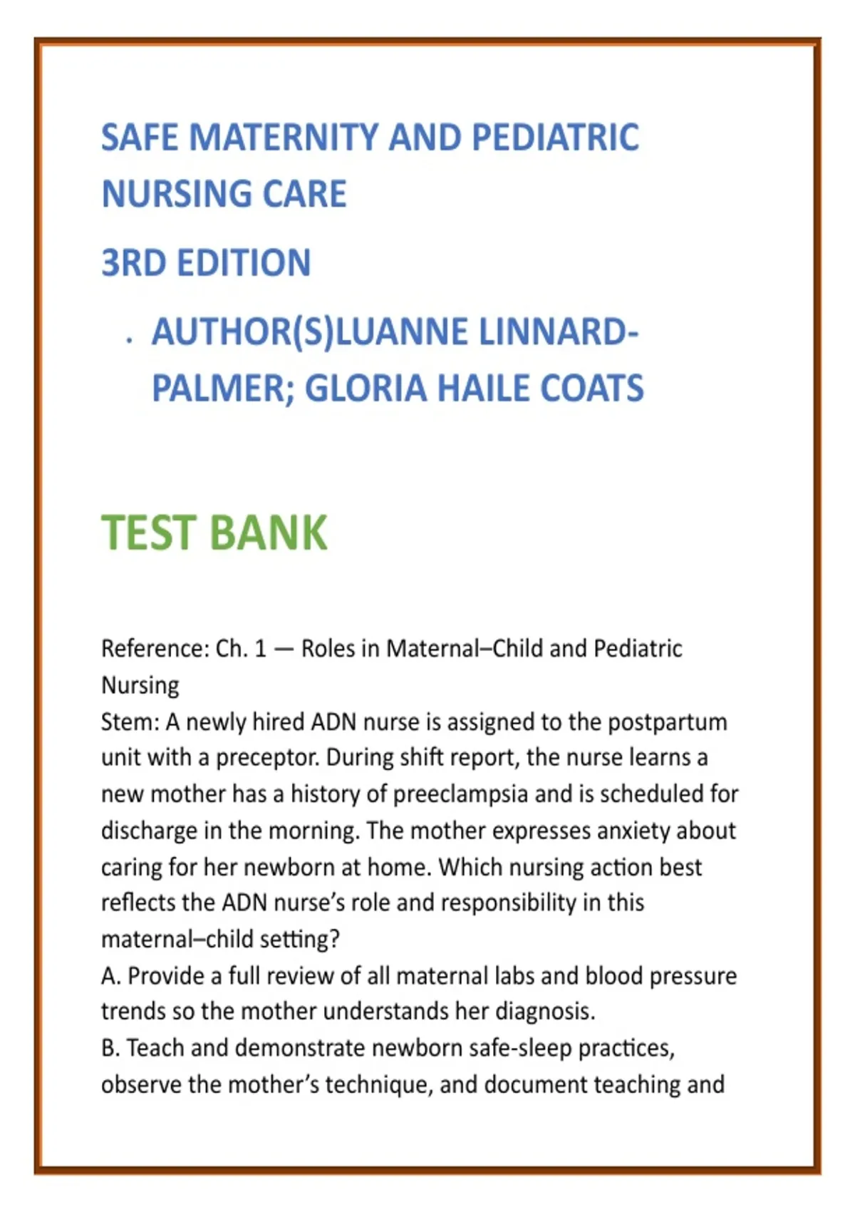 Correct Option: Teaching and demonstrating newborn safe-