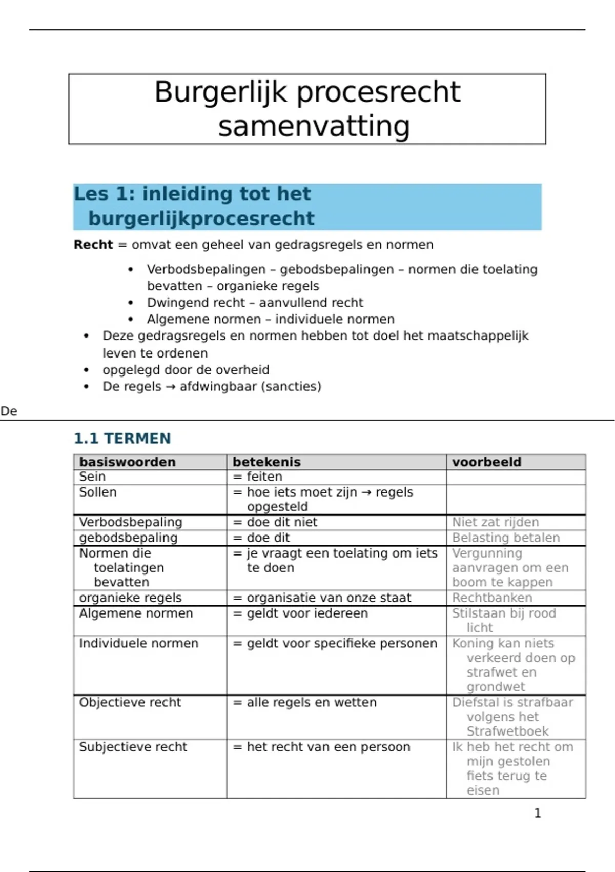 Duidelijke en overzichtelijke samenvatting van burgerlijk procesrecht, gebaseerd op de lessen. Alles is stap voor stap uitgelegd in begrijpelijke taal, met schema’s, ALLE nodige wetsartikelen en uitgewerkte casussen die echt helpen om de leerstof te snappen (die heel handig waren tijdens het examen)