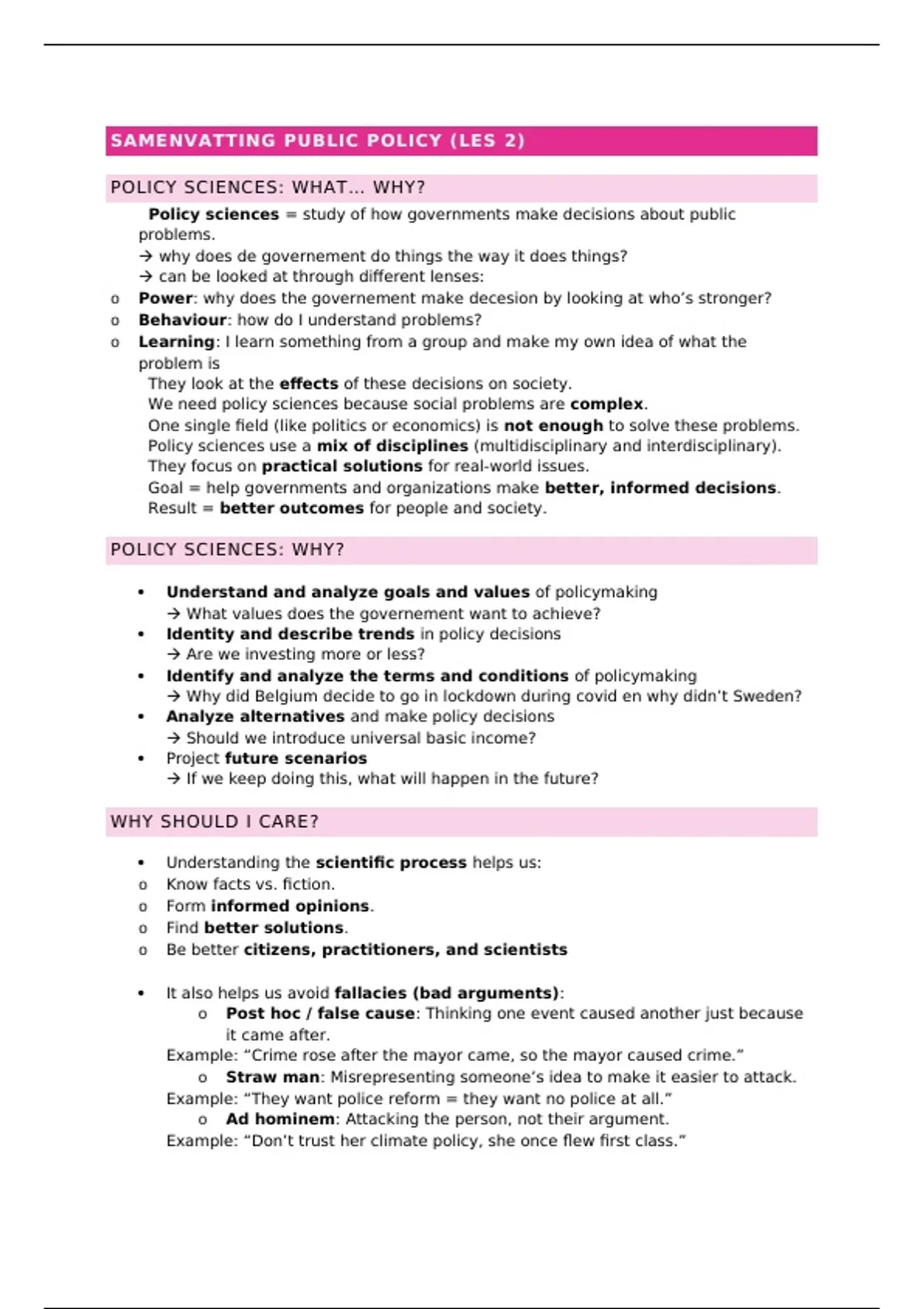SAMENVATTING PUBLIC POLICY (LES 2)