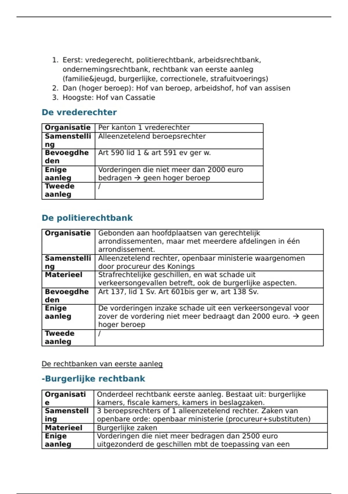 1. Eerst: vredegerecht, politierechtbank, arbeidsrechtbank,