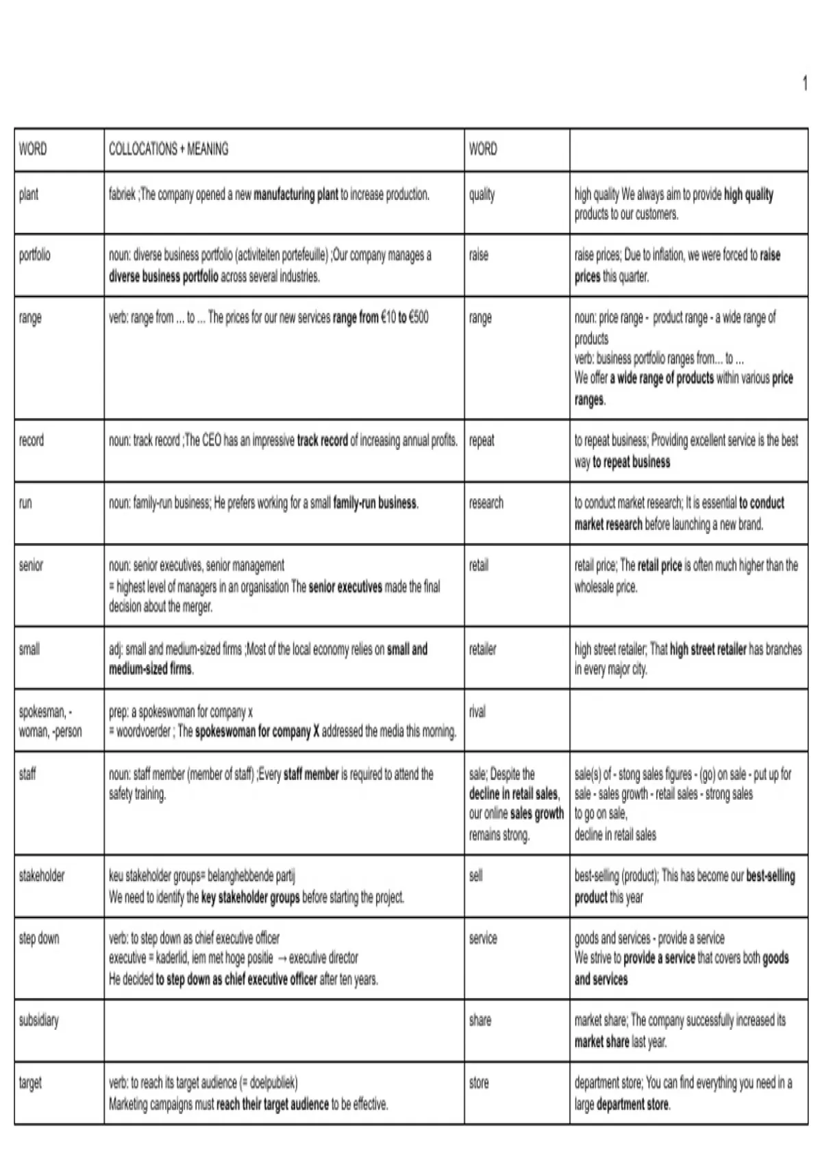 portfolio noun: diverse business portfolio (activiteiten portefeuille) ;Our company manages a raise raise prices; Due to inflation, we were forced to raise