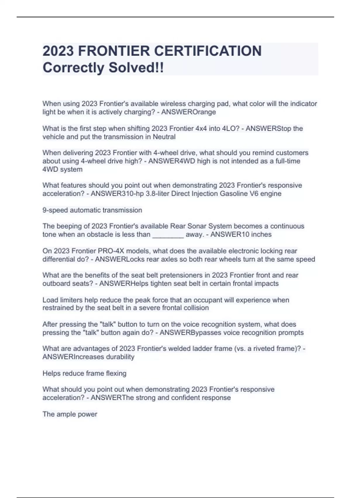 When using 2023 Frontier's available wireless charging pad, what color will the indicator light be when it is actively charging? - ANSWEROrange What is the first step when shifting 2023 Frontier 4x4 into 4LO? - ANSWERStop the vehicle and put the transmission in Neutral When delivering 2023 Frontier with 4-wheel drive, what should you remind customers about using 4-wheel drive high? - ANSWER4WD high is not intended as a full-time 4WD system What features should you point out when demonstrating 2023 Frontier's responsive acceleration? - ANSWER310-hp 3.8-liter Direct Injection Gasoline V6 engine 9-speed automatic transmission The beeping of 2023 Frontier's available Rear Sonar System becomes a continuous tone when an obstacle is less than ________ away. - ANSWER10 inches On 2023 Frontier PRO-4X models, what does the available electronic locking rear differential do? - ANSWERLocks rear axles so both rear wheels turn at the same speed What are the benefits of the seat belt pretensioners in 2023 Frontier front and rear outboard seats? - ANSWERHelps tighten seat belt in certain frontal impacts Load limiters help reduce the peak force that an occupant will experience when restrained by the seat belt in a severe frontal collision After pressing the "talk" button to turn on the voice recognition system, what does pressing the "talk" button again do? - ANSWERBypasses voice recognition prompts What are advantages of 2023 Frontier's welded ladder frame (vs. a riveted frame