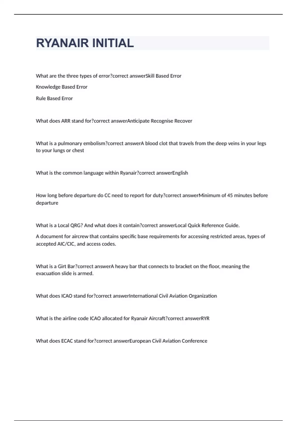 RYANAIR INITIAL exam practice questions with 100% correct answers