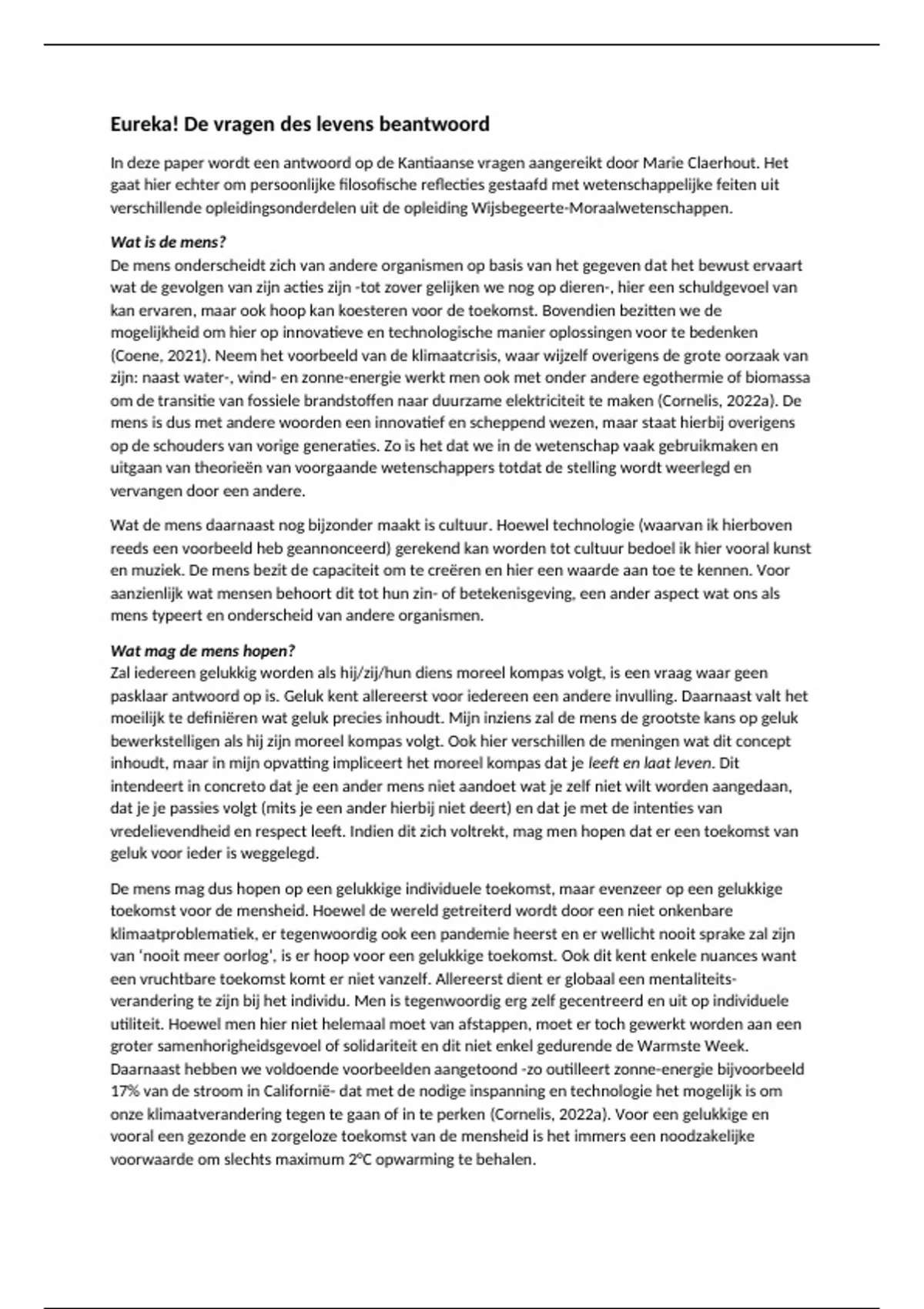 Dit is mijn paper voor het vak 'Mens en omgeving' waarin we een beknopt antwoord dienden te verzinnen op de vier Kantiaanse vragen aan de hand van de cursus. Je kan dit gebruiken ter inspiratie om jouw paper op te baseren. Ik behaalde een 18/20 in 1e zit!