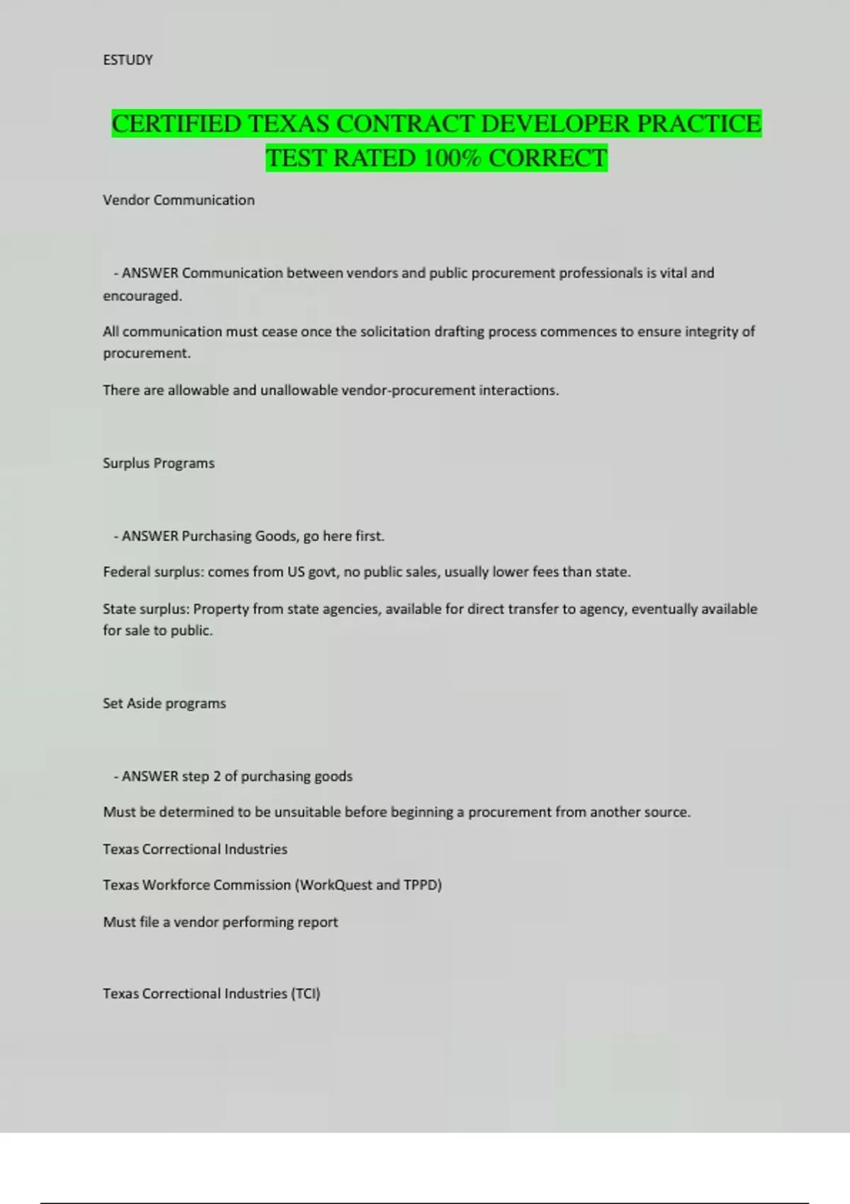 CERTIFIED TEXAS CONTRACT DEVELOPER PRACTICE TEST RATED 100% CORRECT
