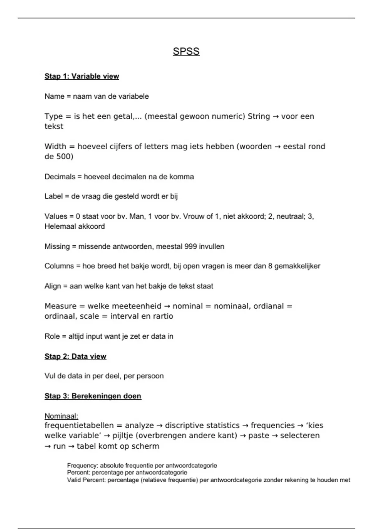 Ik heb de stappen van SPSS voor Statistiek 2 volledig uitgewerkt en uitgeschreven. Er staat extra uitleg in, belangrijke aandachtspunten en al de stappen. De stappen zijn volledig gebaseerd op de namen van de knoppen. Je hoeft dus maar gewoon op te zoeken en te klikken om al de nodige berekeningen te bekomen.