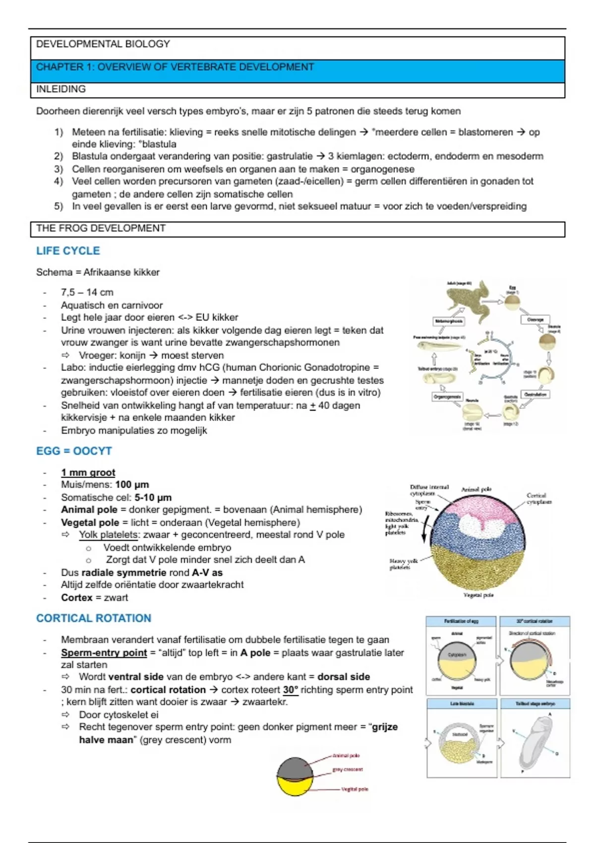 Deze Nederlandstalige samenvatting omvat alle leerstof gezien in het vak Developmental Biology, gegeven door prof. Leyns aan de VUB. Het bevat zowel lesnotities als alle te kennen informatie van de website.