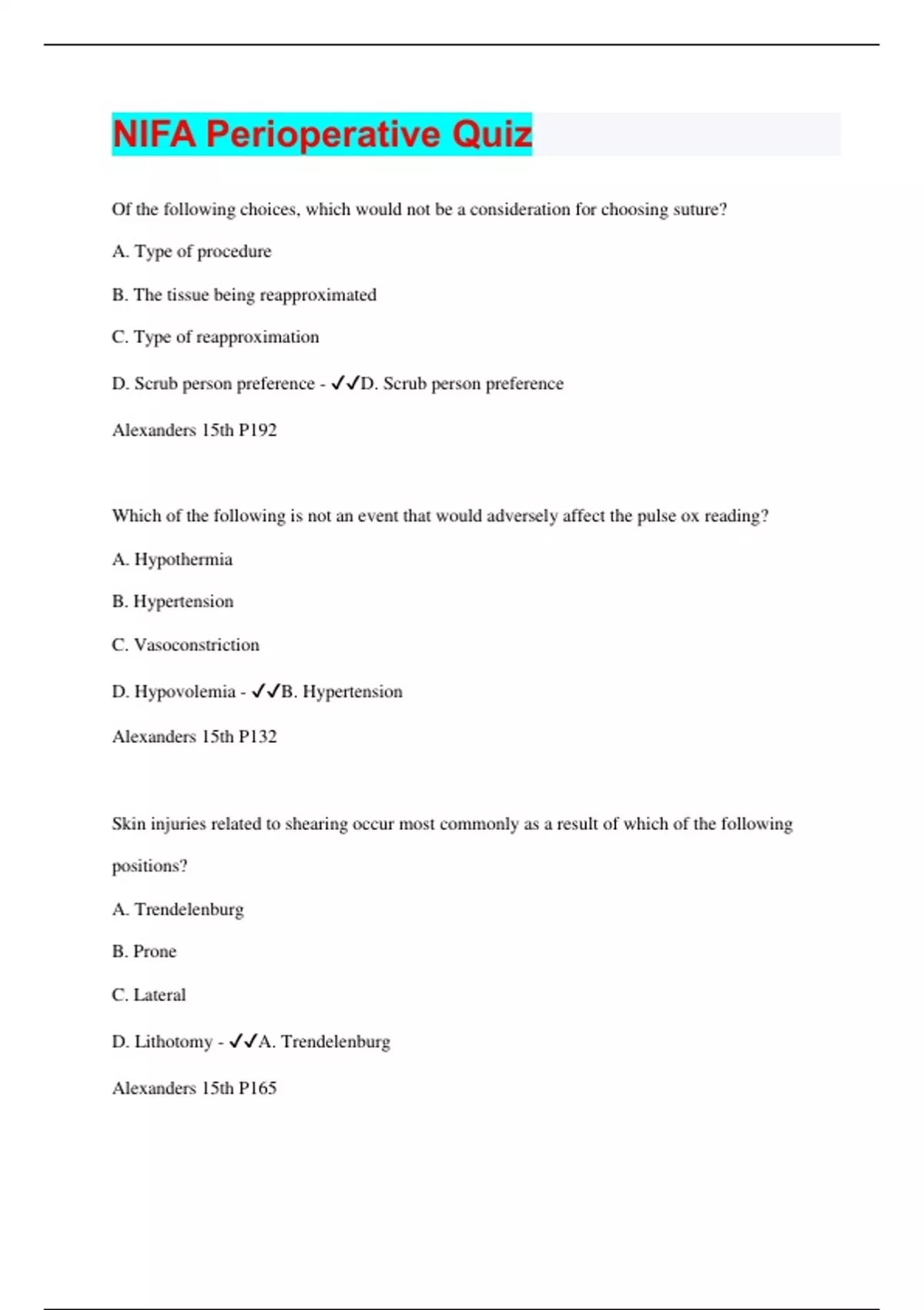 Of the following choices, which would not be a consideration for choosing suture? A. Type of procedure B. The tissue being reapproximated C. Type of reapproximation D. Scrub person preference - D. Scrub person preference Alexanders 15th P192 Which of the following is not an event that would adversely affect the pulse ox reading? A. Hypothermia B. Hypertension C. Vasoconstriction D. Hypovolemia - B. Hypertension Alexanders 15th P132 Skin injuries related to shearing occur most commonly as a result of which of the following positions? A. Trendelenburg B. Prone C. Lateral D. Lithotomy - A. Trendelenburg Alexanders 15th P165