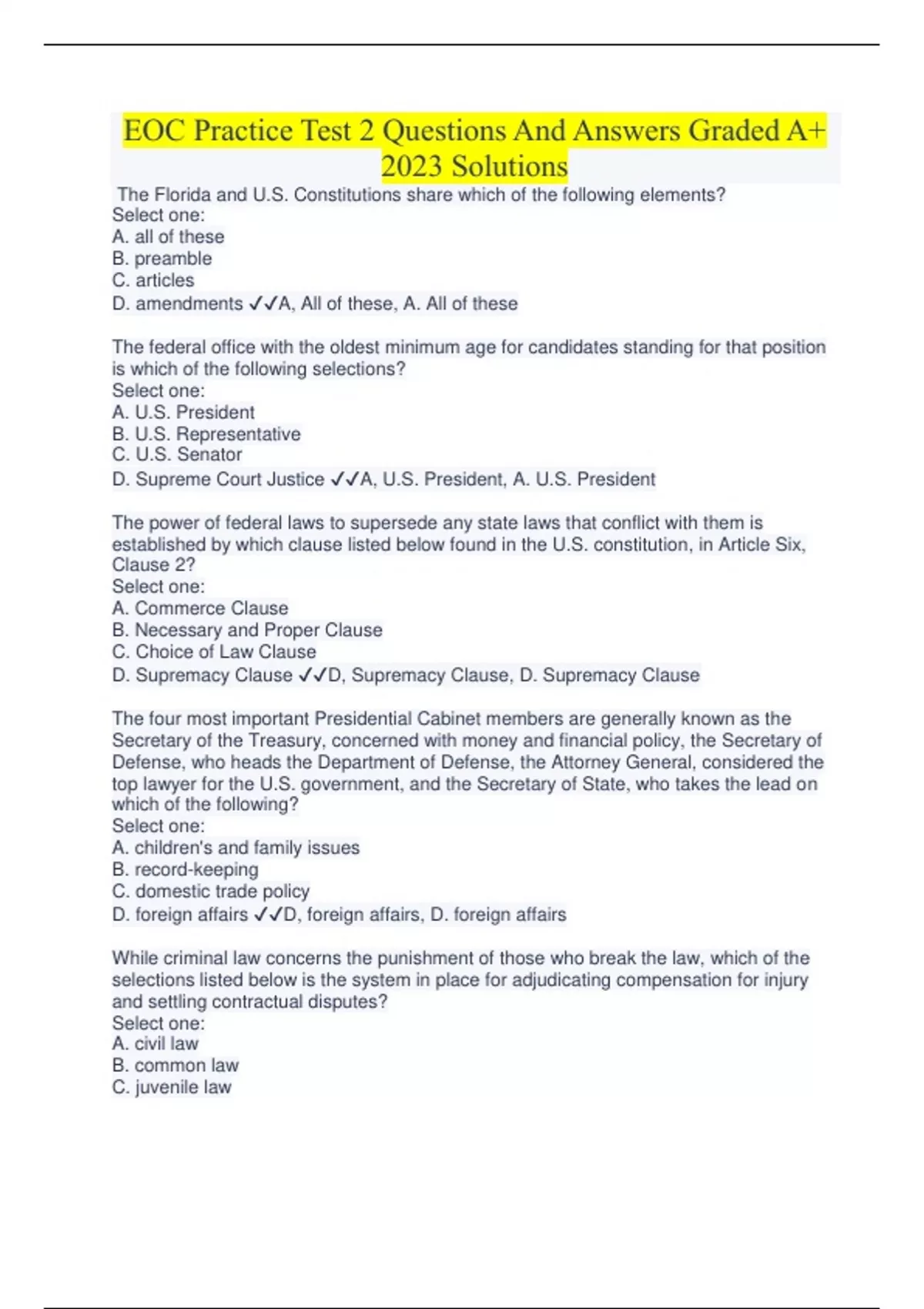 EOC Practice Test 2 Questions And Answers Graded A+ 2023 Solutions The Florida and U.S. Constitutions share which of the following elements? Select one: A. all of these B. preamble C. articles D. amendments A, All of these, A. All of these The federal office with the oldest minimum age for candidates standing for that position is which of the following selections? Select one: A. U.S. President B. U.S. Representative C. U.S. Senator D. Supreme Court Justice A, U.S. President, A. U.S. President The power of federal laws to supersede any state laws that conflict with them is established by which clause listed below found in the U.S. constitution, in Article Six, Clause 2? Select one: A. Commerce Clause B. Necessary and Proper Clause
