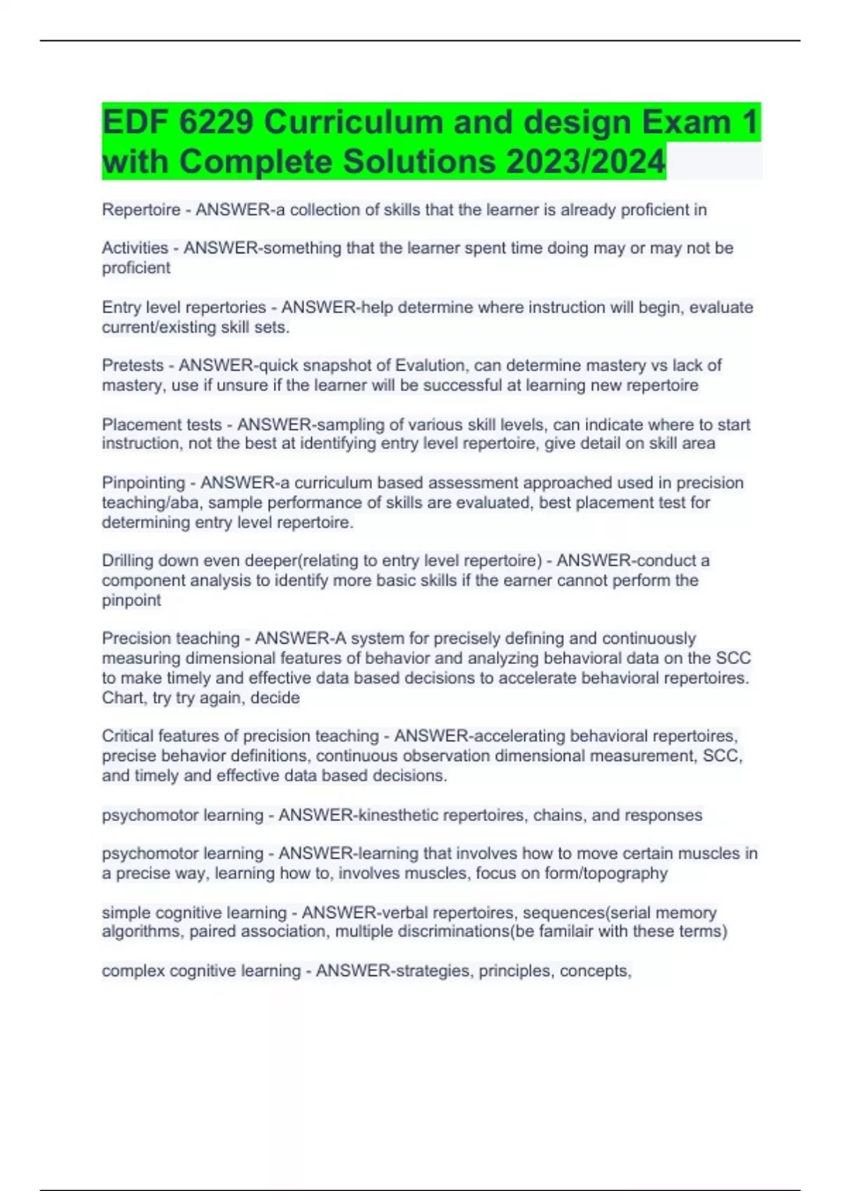 Repertoire - ANSWER-a collection of skills that the learner is already proficient in Activities - ANSWER-something that the learner spent time doing may or may not be proficient Entry level repertories - ANSWER-help determine where instruction will begin, evaluate current/existing skill sets. Pretests - ANSWER-quick snapshot of Evalution, can determine mastery vs lack of mastery, use if unsure if the learner will be successful at learning new repertoire Placement tests - ANSWER-sampling of various skill levels, can indicate where to start instruction, not the best at identifying entry level repertoire, give detail on skill area Pinpointing - ANSWER-a curriculum based assessment approached used in precision teaching/aba, sample performance of skills are evaluated, best placement test for determining entry level repertoire. Drilling down even deeper(relating to entry level repertoire) - ANSWER-conduct a component analysis to identify more basic skills if the earner cannot perform the pinpoint Precision teaching - ANSWER-A system for precisely defining and continuously measuring dimensional features of behavior and analyzing behavioral data on the SCC to make timely and effective data based decisions to accelerate behavioral repertoires. Chart, try try again, decide Critical features of precision teaching - ANSWER-accelerating behavioral repertoires, precise behavior definitions, continuous observation dimensional measurement, SCC, and timely and effective data based decisions. psychomotor learning - ANSWER-kinesthetic repertoires, chains, and responses psychomotor learning - ANSWER-learning that involves how to move certain muscles in a precise way, learning how to, involves muscles, focus on form/topography simple cognitive learning - ANSWER-verbal repertoires, sequences(serial memory algorithms, paired association, multiple discriminations(be familair with these terms) complex cognitive learning - ANSWER-strategies, principles, concepts, Component/composite skills - ANSWER-3 tiers: tool skills, components, composites tool skills - ANSWER-minimal responses that are at the core of many if not all of the skills an concepts inherent in the content area. the most basic fundamental skill. component skills - ANSWER-building blocks tat depend on 1+ tool skill, relative concepts and are not static composite skills - ANSWER-higher-level performance es that socially validate a learners mastery of a content area, made of components Example of tool skills - ANSWER-a tool skill of reading would be letter identification, a tool skill of tacting with adjectives would be a non-vocal object labeling. Critical attributes - ANSWER-defines the thing being taught, necessary for positive reinforcement, mutually exclusive, i the attribute changed/omitted the learned unit completely changes, every example of a learned unit has all critical attributes Variable attributes - ANSWER-accompanies but doesn't define the thing being taught, not all required for positive reinforcement, often the source of stimulus control problems in instruction, if changed just a new example, purposely manipulated Uncontrolled attributes - ANSWER-accompanies but doesn't define the thing being taught, not required for positive reinforcement, often the source of stimulus control problems in instruction, if changed just anew example, purposely left uncontrolled*. (good for generalization) *still things that we can control but choosing not too.*