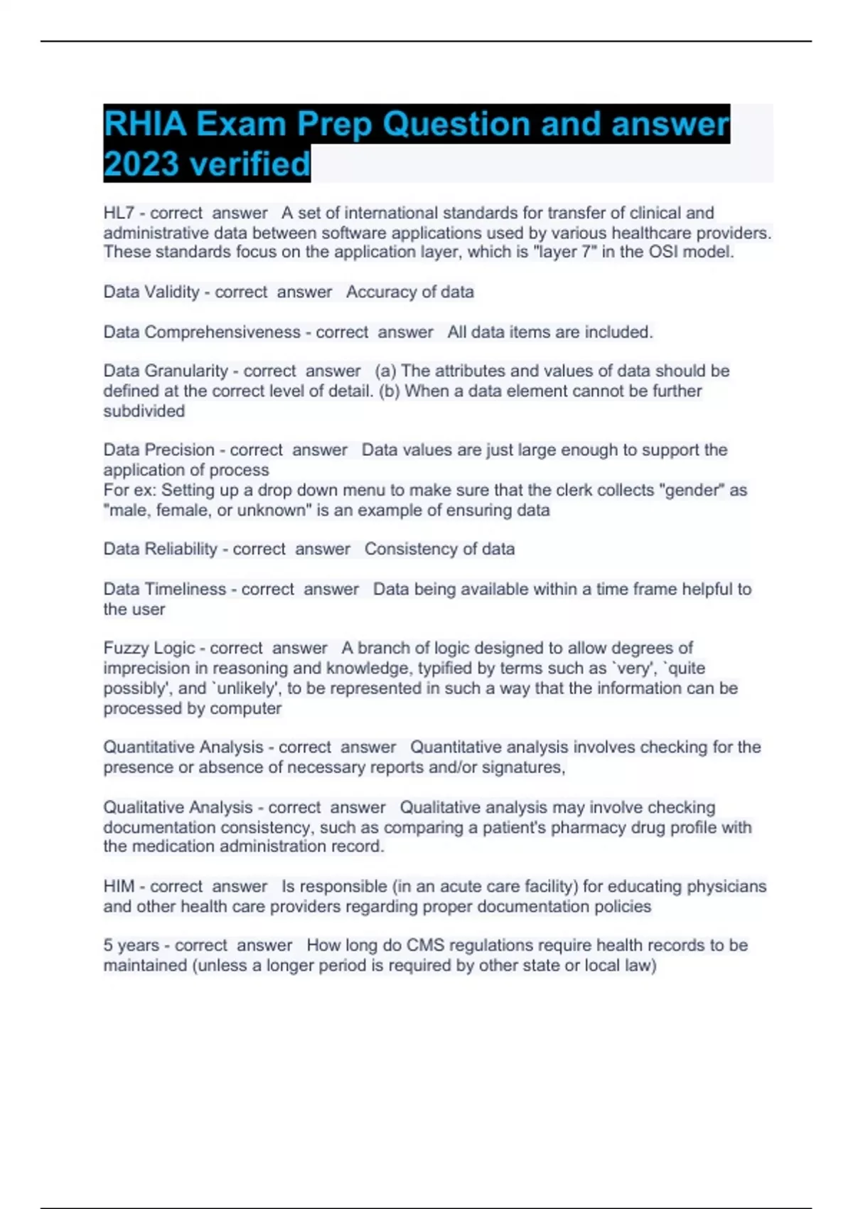 RHIA Exam Prep Question and answer 2023 verified HL7 A set of international standards for transfer of clinical and administrative data between software applications used by various healthcare providers. These standards focus on the application layer, which is "layer 7" in the OSI model. Data Validity Accuracy of data Data Comprehensiveness All data items are included. Data Granularity (a) The attributes and values of data should be defined at the correct level of detail. (b) When a data element cannot be further subdivided Data Precision Data values are just large enough to support the application of process For ex: Setting up a drop down menu to make sure that the clerk collects "gender" as "male, female, or unknown" is an example of ensuring data Data Reliability Consistency of data Data Timeliness Data being available within a time frame helpful to the user Fuzzy Logic A branch of logic designed to allow degrees of imprecision in reasoning and knowledge, typified by terms such as `very', `quite possibly', and `unlikely', to be represented in such a way that the information can be processed by computer Quantitative Analysis Quantitative analysis involves checking for the presence or absence of necessary reports and/or signatures, Qualitative Analysis Qualitative analysis may involve checking documentation consistency, such as comparing a patient's pharmacy drug profile with the medication administration record. HIM Is responsible (in an acute care facility) for educating physicians and other health care providers regarding proper documentation policies 5 years How long do CMS regulations require health records to be maintained (unless a longer period is required by other state or local law) AHIMA recommends that PHI for minors be retained for this long unless a longer period is required by other state or federal law Age of majority plus statute of limitation