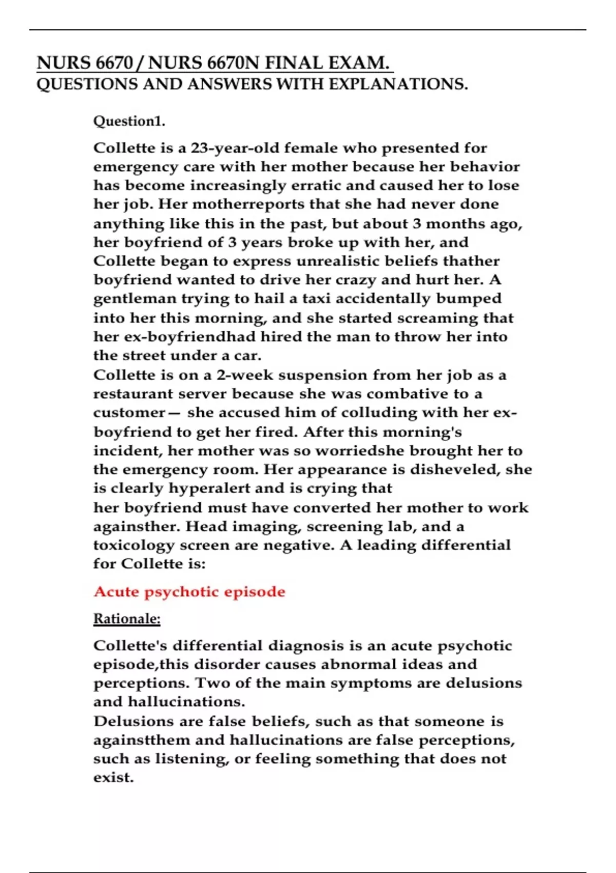 NURS 6670 / NURS 6670N FINAL EXAM. QUESTIONS AND ANSWERS WITH EXPLANATIONS.Question1. Collette is a 23-year-old female who presented for emergency care with her mother because her behavior has become increasingly erratic and caused her to lose her job. Her mother reports that she had never done anything like this in the past, but about 3 months ago, her boyfriend of 3 years broke up with her, and Collette began to express unrealistic beliefs that her boyfriend wanted to drive her crazy and hurt her. A gentleman trying to hail a taxi accidentally bumped into her this morning, and she started screaming that her ex-boyfriend had hired the man to throw her into the street under a car. Collette is on a 2-week suspension from her job as a restaurant server because she was combative to a customer— she accused him of colluding with her exboyfriend to get her fired. After this morning's incident, her mother was so worried she brought her to the emergency room. Her appearance is disheveled, she is clearly hyperalert and is crying that her boyfriend must have converted her mother to work against her. Head imaging, screening lab, and a toxicology screen are negative. A leading differential for Collette is: Acute psychotic episode Rationale: Collette's differential diagnosis is an acute psychotic episode, this disorder causes abnormal ideas and perceptions. Two of the main symptoms are delusions and hallucinations. Delusions are false beliefs, such as that someone is against them and hallucinations are false perceptions, such as listening, or feeling something that does not exist.