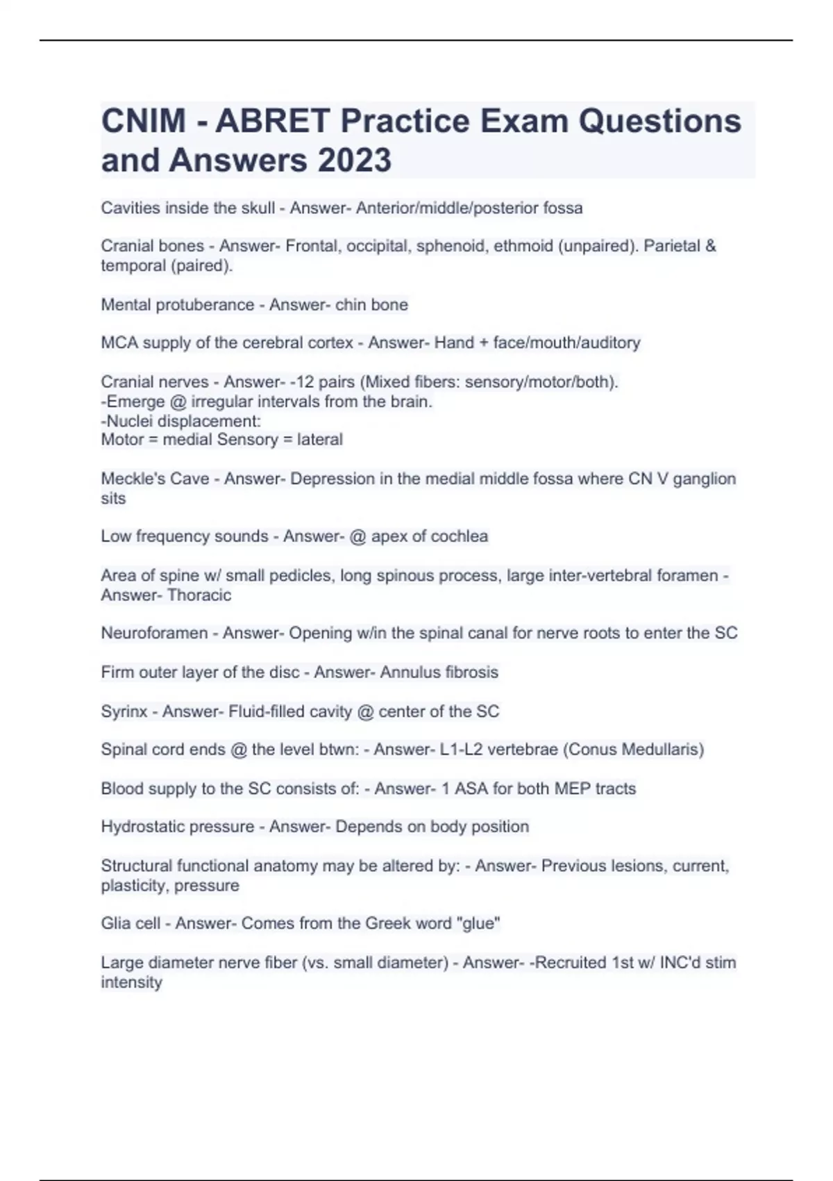 Cavities inside the skull - Answer- Anterior/middle/posterior fossa Cranial bones - Answer- Frontal, occipital, sphenoid, ethmoid (unpaired). Parietal & temporal (paired). Mental protuberance - Answer- chin bone MCA supply of the cerebral cortex - Answer- Hand + face/mouth/auditory Cranial nerves - Answer- -12 pairs (Mixed fibers: sensory/motor/both). -Emerge @ irregular intervals from the brain. -Nuclei displacement: Motor = medial Sensory = lateral Meckle's Cave - Answer- Depression in the medial middle fossa where CN V ganglion sits Low frequency sounds - Answer- @ apex of cochlea Area of spine w/ small pedicles, long spinous process, large inter-vertebral foramen - Answer- Thoracic Neuroforamen - Answer- Opening w/in the spinal canal for nerve roots to enter the SC Firm outer layer of the disc - Answer- Annulus fibrosis Syrinx - Answer- Fluid-filled cavity @ center of the SC Spinal cord ends @ the level btwn: - Answer- L1-L2 vertebrae (Conus Medullaris) Blood supply to the SC consists of: - Answer- 1 ASA for both MEP tracts Hydrostatic pressure - Answer- Depends on body position Structural functional anatomy may be altered by: - Answer- Previous lesions, current, plasticity, pressure Glia cell - Answer- Comes from the Greek word "glue" Large diameter nerve fiber (vs. small diameter) - Answer- -Recruited 1st w/ INC'd stim intensity -Higher conduction velocity -More vulnerable to hypoxia & pressure Δ's Synaptic transmission, and/or Δ's in thalamocortical projections, produce - Answer- Cortical potentials Peripheral nerve sensitivity - Answer- Least sensitive to injury (more sensitive = SC grey/white mater, cortical grey matter) Cavernous angiomas - Answer- Multi-lobulated lesions containing hemorrhage Geriatric population: prevalence of temporal bone hyperostosis - Answer- 10-15% Presbycusis - Answer- High freq hearing loss; gradually occurs in older individuals Most commonly injured CN - Answer- Facial nerve (VII) Burst fracture - Answer- -Break in the vertebra -Failure of anterior & middle vertebral columns -Caused by violent compressive event (fall, MVA) Excessive neck flexion in sitting position - Answer- Quadraparesis (due to ischemia in upper T-spine)