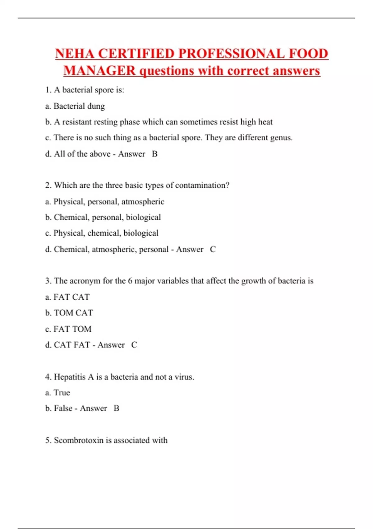 1. A bacterial spore is: a. Bacterial dung b. A resistant resting phase which can sometimes resist high heat c. There is no such thing as a bacterial spore. They are different genus. d. All of the above - Answer B 2. Which are the three basic types of contamination? a. Physical, personal, atmospheric b. Chemical, personal, biological c. Physical, chemical, biological d. Chemical, atmospheric, personal - Answer C 3. The acronym for the 6 major variables that affect the growth of bacteria is a. FAT CAT b. TOM CAT c. FAT TOM d. CAT FAT - Answer C 4. Hepatitis A is a bacteria and not a virus. a. True b. False - Answer B 5. Scombrotoxin is associated with