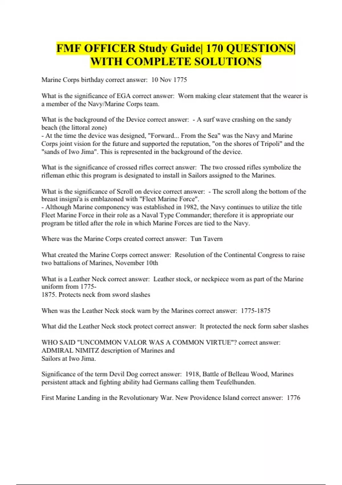 FMF OFFICER Study Guide| 170 QUESTIONS| WITH COMPLETE SOLUTIONS. Marine Corps birthday correct answer: 10 Nov 1775 What is the significance of EGA correct answer: Worn making clear statement that the wearer is a member of the Navy/Marine Corps team. What is the background of the Device correct answer: - A surf wave crashing on the sandy beach (the littoral zone) - At the time the device was designed, "Forward... From the Sea" was the Navy and Marine Corps joint vision for the future and supported the reputation, "on the shores of Tripoli" and the "sands of Iwo Jima". This is represented in the background of the device. What is the significance of crossed rifles correct answer: The two crossed rifles symbolize the rifleman ethic this program is designated to install in Sailors assigned to the Marines. What is the significance of Scroll on device correct answer: - The scroll along the bottom of the breast insigni'a is emblazoned with "Fleet Marine Force". - Although Marine componency was established in 1982, the Navy continues to utilize the title Fleet Marine Force in their role as a Naval Type Commander; therefore it is appropriate our program be titled after the role in which Marine Forces are tied to the Navy. Where was the Marine Corps created correct answer: Tun Tavern What created the Marine Corps correct answer: Resolution of the Continental Congress to raise two battalions of Marines, November 10th What is a Leather Neck correct answer: Leather stock, or neckpiece worn as part of the Marine uniform from 1775- 1875. Protects neck from sword slashes When was the Leather Neck stock warn by the Marines correct answer: What did the Leather Neck stock protect correct answer: It protected the neck form saber slashes WHO SAID "UNCOMMON VALOR WAS A COMMON VIRTUE"? correct answer: ADMIRAL NIMITZ description of Marines and Sailors at Iwo Jima. Significance of the term Devil Dog correct answer: 1918, Battle of Belleau Wood, Marines persistent attack and fighting ability had Germans calling them Teufelhunden. First Marine Landing in the Revolutionary War. New Providence Island correct answer: 1776 Congress recreated the Marine Corps as separate service correct answer: 1798 WHAT HAPPEND IN 1847 correct answer: BATTLE OF CHIPULTEPEC, MEXICO CITY MARINES OCCUPIED HALLS OF MONTEZUMA WHERE ARE THE HALLS OF MONTEZUMA correct answer: MEXICO CITY WHAT HAPPENED IN 1805 correct answer: MARINES STORMED THE SHORES OF TRIPOLI, BARBARY PIRATES MARINES UNDER THE COMMAND OF COL ROBERT E. LEE U.S. ARMY, STORMED THE U.S ARSENAL AT HARPERS FERRY AND PUT DOWN AN ATTEMPTED SLAVE REVOLT LED BY ABOLITIONIST, JOHN BROWN correct answer: 1859 WHAT HAPPENED IN 1868 correct answer: EGA ADOPTED BY THE MARINE CORPS BY GENERAL JACOB ZEILIN, WHO MODIFIED THE ROYAL MARINE EMBLEM BOXER REBELLION IN PEKING. MARINES PART OF MULTI NATIONAL DEFENSE FORCE TO LEGATION QUARTER correct answer: 1900 WHAT HAPPENED IN 1913 correct answer: ESTABLISHED THE FIRST AVIATION UNIT. MAJOR ALFRED CUNNINGHAM WAS FIRST PILOT Marines came under department of the Navy correct answer: 1834 WWI LANDING IN FRANCE, 8 DISTINCT OPERATIONS. 5TH AND 6TH MARINES AWARDED THE FRENCH FOURRAGERE correct answer: 1917 MARINE CORPS REORGANIZED INTO FMF. ESTABLISHED COMMAND AND ADMINISTRATIVE RELATIONSHIP WITH FLEET correct answer: 1933 WWII STRENGTH NEARLHY 500K. MARINES USED AS PRINCIPLE FORCE IN ISLAND HOPPING CAMPAIGN correct answer: 1941 CONFLICT IN KOREA TEST MARINE CORPS READINESS. MADE AN AMPHIBIOUS LANDING OVER SEA WALLS AT INCHON. MARINE AVIATORS FLEW HELICOPTERS FOR THE FIRST TIME IN BATTLE correct answer: 1950 MARINE CORPS COMPLETED REORGANIZING THE COMBAT STRUCTURE OF ITS FMF, USED WHEN LANDING NEAR BEIRUT, LEBANON TO SUPPORTS ITS ARMY AGAINST INTERNAL STRIFE correct answer: 1958 WHAT HAPPENED IN 1965 correct answer: Marines landed in South Vietnam committing them to the longest war in its history. Conducted many large scale offensive operations, participated in pacification program to win support of local population, and landed in Dominican Republic to evacuate and protect US citizens. Marines deployed to Lebanon as part of multinational peacekeeping force, displaying Marine concept of "Force of Readiness" correct answer: 1982 Marines participated in Urgent Fury, a joint military operation, securing the island of Grenada correct answer: 1983 Operation Just Cause due to unrest in Panama and overthrew General Manuel Noriega. correct answer: 1989 Operation Desert Shield. Validated the MPF concep correct answer: 1990 Operation Desert Storm. Marines swept into Kuwait and liberated the country of Iraq. correct answer: 1991 WHERE WAS THE STARS AND STRIPS FIRST RAISED ONT THE EASTERN HEMOSPHIRE correct answer: SHORES OF TRIPOLI WHAT BATTLE HAD THE HIGHEST CASUILTY RATE EVER FOR MARINES correct answer: BATTLE OF IWOJIMA WHAT WAS THE CASUALTY RATE IN THE BATLE OF IWOJIMA correct answer: 1 IN 4 WHAT DOES FIRST-TO-FIGHT MEAN correct answer: THE MARINES HAVE BEEN ON THE FRONTLINE OF EVERY BATTLE Heroism in battle of Tripoli. Mameluke sword presented to him in 1805. correct answer: 1stLt Presley O'Bannon WHEN DID OPHA MAY JOHNSON ENLIST IN THE MARINES correct answer: 13 AUG 1918 WHO IS ARCHAIBALD HENDERSON correct answer: THE GRAND OLD MAN OF THE MARINE CORPS WHEN WAS ARCHIBALD HENDERSON THE COMMANDONT OF THE MARINE CORPS correct answer: HOW LONG DID ARHABOLD HENDERSON SERVE AS TEH COMMANDANT OF THE MARINE CORPS correct answer: 39 YEARS.