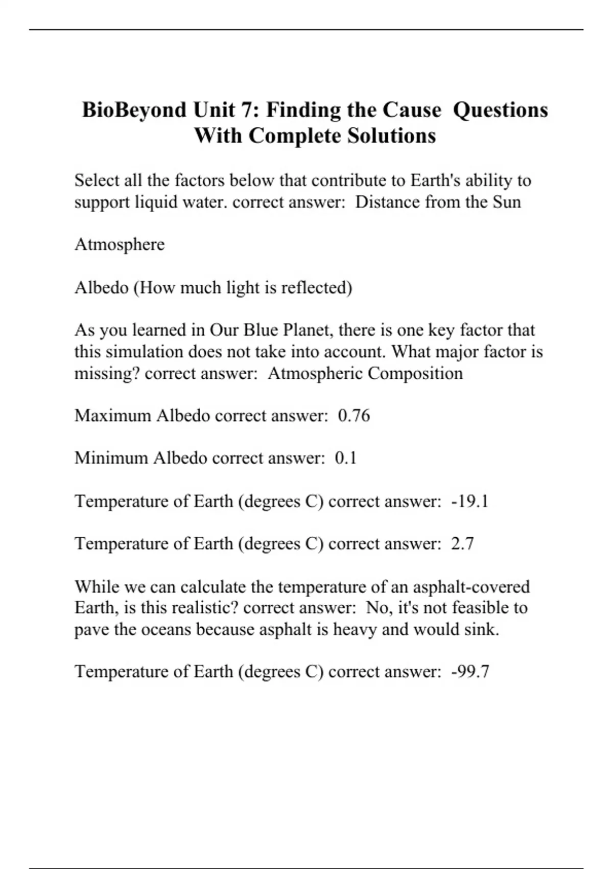 Select all the factors below that contribute to Earth's ability to support liquid water. correct answer: Distance from the Sun Atmosphere Albedo (How much light is reflected) As you learned in Our Blue Planet, there is one key factor that this simulation does not take into account. What major factor is missing? correct answer: Atmospheric Composition Maximum Albedo correct answer: 0.76 Minimum Albedo correct answer: 0.1 Temperature of Earth (degrees C) correct answer: -19.1 Temperature of Earth (degrees C) correct answer: 2.7 While we can calculate the temperature of an asphalt-covered Earth, is this realistic? correct answer: No, it's not feasible to pave the oceans because asphalt is heavy and would sink. Temperature of Earth (degrees C) correct answer: -99.7 While we can calculate the temperature of a snow-covered Earth, do you think this is realistic? You wi