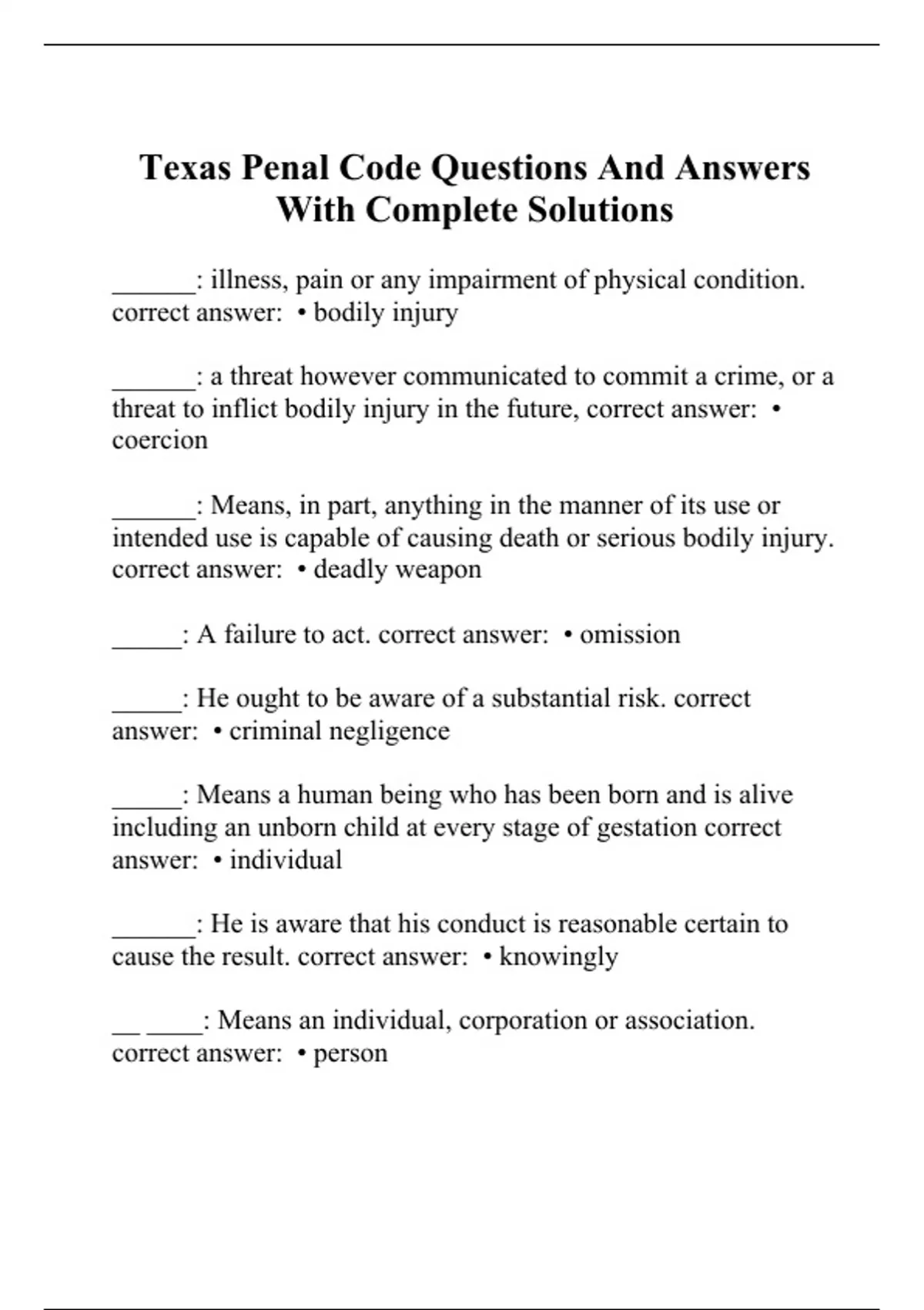 ______: illness, pain or any impairment of physical condition. correct answer: • bodily injury ______: a threat however communicated to commit a crime, or a threat to inflict bodily injury in the future, correct answer: • coercion ______: Means, in part, anything in the manner of its use or intended use is capable of causing death or serious bodily injury. correct answer: • deadly weapon _____: A failure to act. correct answer: • omission _____: He ought to be aware of a substantial risk. correct answer: • criminal negligence _____: Means a human being who has been born and is alive including an unborn child at every stage of gestation correct answer: • individual ______: He is aware that his conduct is reasonable certain to cause the result. correct answer: • knowingly __ ____: Means an individual, corporation or association. correct answer: • person ______: He is aware of but consciously disrega