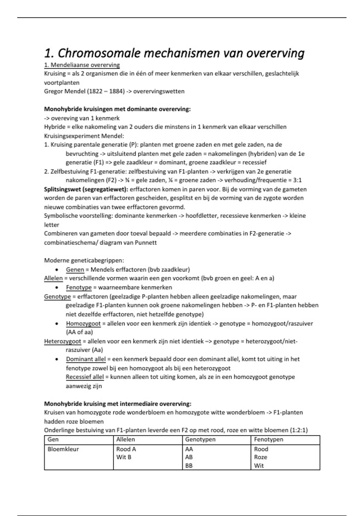 Samenvatting Hoofdstuk 1 'Chromosomale mechanismen van overerving' biogenie 6.2
