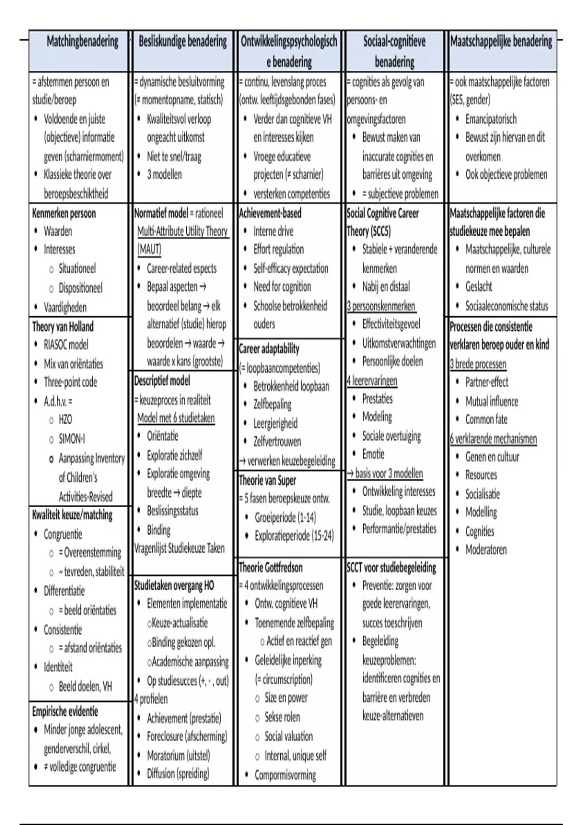 Matchingbenadering Besliskundige benadering Ontwikkelingspsychologisch Sociaal-cognitieve Maatschappelijke benadering