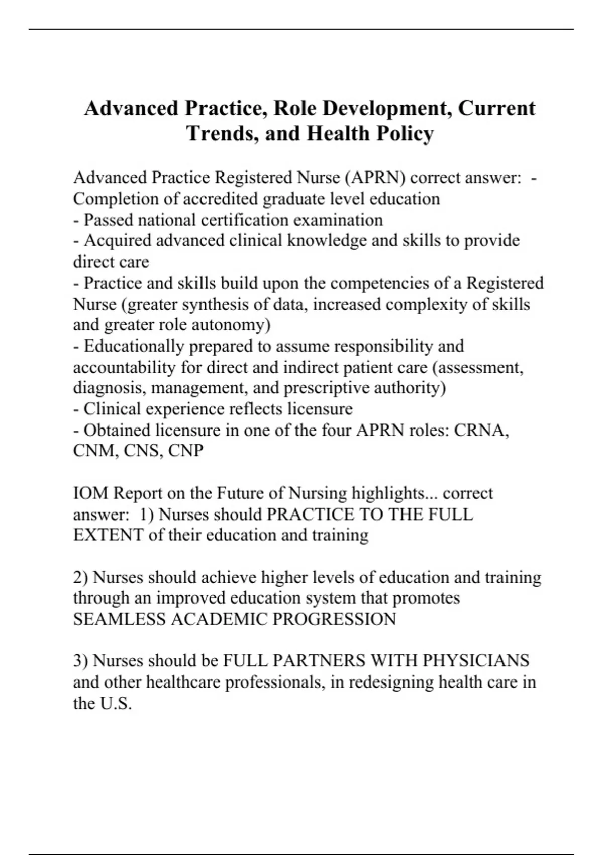 Advanced Practice Registered Nurse (APRN) correct answer: - Completion of accredited graduate level education - Passed national certification examination - Acquired advanced clinical knowledge and skills to provide direct care - Practice and skills build upon the competencies of a Registered Nurse (greater synthesis of data, increased complexity of skills and greater role autonomy) - Educationally prepared to assume responsibility and accountability for direct and indirect patient care (assessment, diagnosis, management, and prescriptive authority) - Clinical experience reflects licensure - Obtained licensure in one of the four APRN roles: CRNA, CNM, CNS, CNP IOM Report on the Future of Nursing highlights... correct answer: 1) Nurses should PRACTICE TO THE FULL EXTENT of their education and training 2) Nurses should achieve higher levels of education and training through an improved education system that promotes SEAMLESS ACADEMIC PROGRESSION 3) Nurses should be FULL PARTNERS WITH PHYSICIANS and other healthcare professionals, in redesigning health care in the U.S.