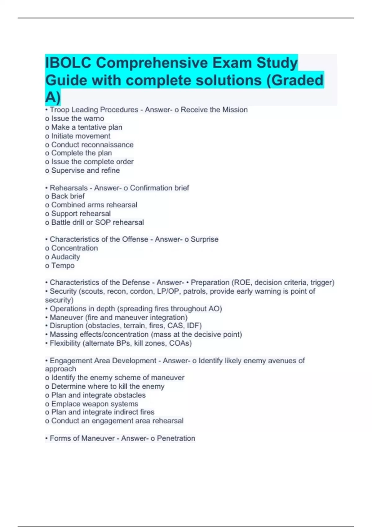• Troop Leading Procedures - Answer- o Receive the Mission o Issue the warno o Make a tentative plan o Initiate movement o Conduct reconnaissance o Complete the plan o Issue the complete order o Supervise and refine • Rehearsals - Answer- o Confirmation brief o Back brief o Combined arms rehearsal o Support rehearsal o Battle drill or SOP rehearsal • Characteristics of the Offense - Answer- o Surprise o Concentration o Audacity o Tempo • Characteristics of the Defense - Answer- • Preparation (ROE, decision criteria, trigger) • Security (scouts, recon, cordon, LP/OP, patrols, provide early warning is point of security) • Operations in depth (spreading fires throughout AO) • Maneuver (fire and maneuver integration) • Disruption (obstacles, terrain, fires, CAS, IDF) • Massing effects/concentration (mass at the decisive point) • Flexibility (alternate BPs, kill zones, COAs) • Engagement Area Development - Answer- o Identify likely enemy avenues of approach o Identify the enemy scheme of maneuver o Determine where to kill the enemy o Plan and integrate obstacles o Emplace weapon systems o Plan and integrate indirect fires o Conduct an engagement area rehearsal • Forms of Maneuver - Answer- o Penetration o Infiltration o Frontal o Flanking o Envelopment o Turning Characteristics of Fire - Answer- o Line of sight o Burst of fire o Trajectory o Maximum ordinate o Cone of fire o Beaten zone o Danger space o Surface danger zone (SDZ) Classifications of Automatic Weapons Fire with Respect to the Ground - Answer- o Dead space o Grazing fires o Plunging fires Classifications of Automatic Weapons Fire with Respect to the Target - Answer- o Enfilade fire o Frontal fire o Flanking fire o Oblique fire Classifications of Automatic Weapons Fire with Respect to the Machine Gun - Answer- o Fixed fire o Traversing fire o Searching fire o Traversing and searching fire o Swinging traverse fire o Free gun Distribution, concentration, and rate of fire - Answer- o Sustained o Rapid o Cyclic Range card - Answer- DA Form 5517-R Characteristics of the Stryker and its weapon systems - Answer- o Wheeled o .50 Cal M2, M240, MK19 Elements of a Multi-dimensional Urban Battlefield - Answer- o Airspace o Super-surface o Surface o Subsurface Urban Patterns - Answer- o Satellite areas o Networked o Linear o Segment Conditions of Urban Operations - Answer- o Surgical o Precision o High intensity Fundamentals of Urban Operations - Answer- o Perform Aggressive Information Operations o Maintain a Close Combat Capability o Avoid the Attrition Approach o Control the Essential o Minimize Collateral Damage o Separate Noncombatants from Combatants o Preserve Critical Infrastructure o Restore Essential Services o Understand the Human Dimension o Create a Collaborative Information Environment o Transition Control Breaching Fundamentals and Organization - Answer- o Suppress o Obscure o Secure o Reduce o Assault