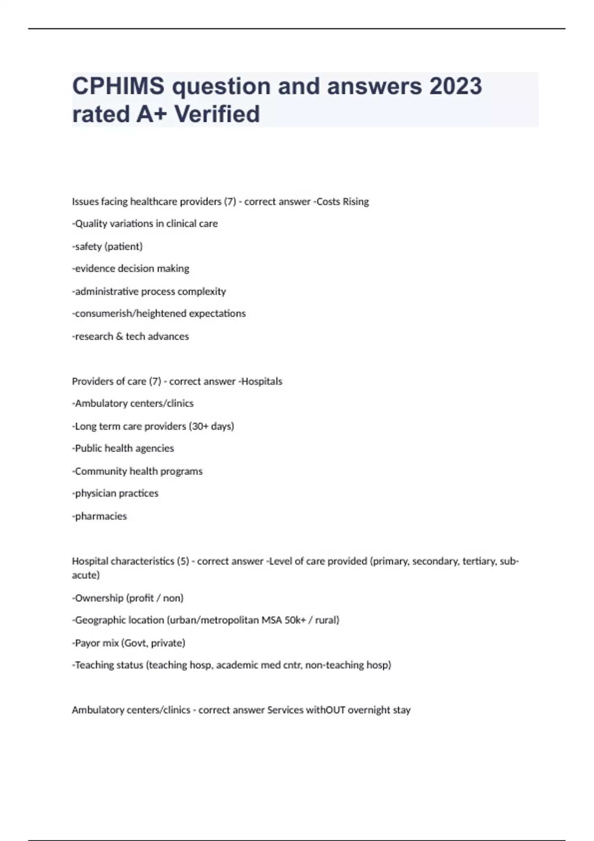 CPHIMS question and answers 2023 rated A+ VerifiedIssues facing healthcare providers (7) - correct answer -Costs Rising -Quality variations in clinical care -safety (patient) -evidence decision making -administrative process complexity -consumerish/heightened expectations -research & tech advances Providers of care (7) - correct answer -Hospitals -Ambulatory centers/clinics -Long term care providers (30+ days) -Public health agencies -Community health programs -physician practices -pharmacies Hospital characteristics (5) - correct answer -Level of care provided (primary, secondary, tertiary, sub-acute) -Ownership (profit / non) -Geographic location (urban/metropolitan MSA 50k+ / rural) -Payor mix (Govt, private) -Teaching status (teaching hosp, academic med cntr, non-teaching hosp) Ambulatory centers/clinics - correct answer Services withOUT overnight stay Long Term Care Services (4) - correct answer 30+ days -Nursing Home -Rehab -Mental Health -Home Health Physician Practice types (2) - correct answer -Group practices -Solo practices CPOE - correct answer Computerized Practitioner Order Entry (used at pharmacies) Integrated Delivery Network (IDN) - correct answer Variety of providers organized to provide a continuum of care (with integrated administration and information sharing) Formed through -Merger/Acquisition -Joint venture -Alliance -Network (e.g. virtual organization... IPA) Key factors to IDN success (2) - correct answer -Physician involvement -Interoperable info systems Payment Systems (2) - correct answer Private Financing -private insurance -out of pocket (fee for service) Public financing
