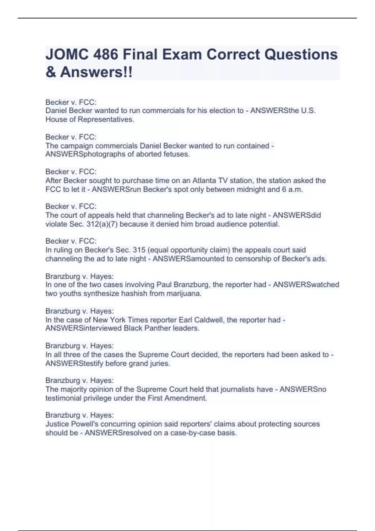 Becker v. FCC: Daniel Becker wanted to run commercials for his election to - ANSWERSthe U.S. House of Representatives. Becker v. FCC: The campaign commercials Daniel Becker wanted to run contained - ANSWERSphotographs of aborted fetuses. Becker v. FCC: After Becker sought to purchase time on an Atlanta TV station, the station asked the FCC to let it - ANSWERSrun Becker's spot only between midnight and 6 a.m. Becker v. FCC: The court of appeals held that channeling Becker's ad to late night - ANSWERSdid violate Sec. 312(a)(7) because it denied him broad audience potential. Becker v. FCC: In ruling on Becker's Sec. 315 (equal opportunity claim) the appeals court said channeling the ad to late night - ANSWERSamounted to censorship of Becker's ads. Branzburg v. Hayes: In one of the two cases involving Paul Branzburg, the reporter had - ANSWERSwatched two youths synthesize hashish from marijuana. Branzburg v. Hayes: In the case of New York Times reporter Earl Caldwell, the reporter had - ANSWERSinterviewed Black Panther leaders. Branzburg v. Hayes: In all three of the cases the Supreme Court decided, the reporters had been asked to - ANSWERStestify before grand juries. Branzburg v. Hayes: The majority opinion of the Supreme Court held that journalists have - ANSWERSno testimonial privilege under the First Amendment. Branzburg v. Hayes: Justice Powell's concurring opinion said reporters' claims about protecting sources should be - ANSWERSresolved on a case-by-case basis. Brown v. Perdue: Which of the following best describes the situation presented by Brown v. Perdue? - ANSWERSBrown is suing for a declaration that he did NOT infringe on Perdue's copyrights. Brown v. Perdue: In the case of New York Times reporter Earl Caldwell, the repor