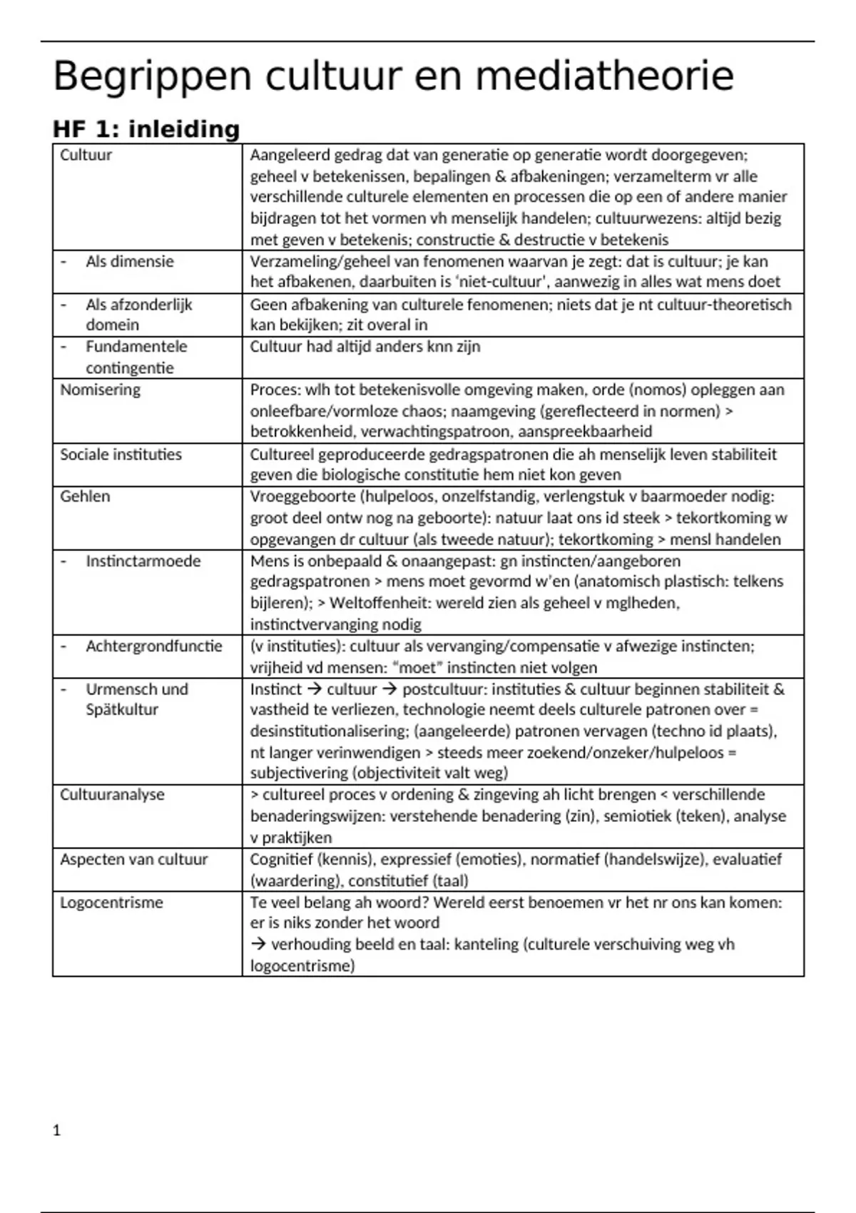 Dit document biedt een (beknopte, maar) duidelijke begrippenlijst van het vak Cultuur- en Mediatheorie dat wordt gegeven in de tweede bachelor Sociologie. Hoofdstuk 1: Inleiding Hoofdstuk 2: Cultuur - connotaties van een begrip Hoofdstuk 3: Benaderingen van cultuur Hoofdstuk 4: Elementen van cultuur Hoofdstuk 5: Hogere versus lagere culturen Hoofdstuk 6: Moderniteit, modernisering en postmoderniteit (hoofdstuk 7)