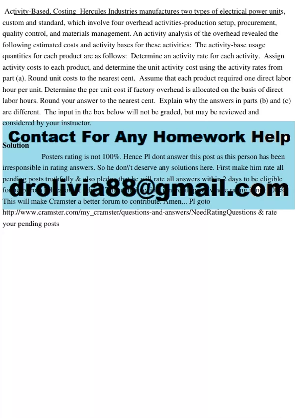 Activity-Based, Costing Hercules Industries manufactures two types of electrical power units, custom and standard, which involve four overhead activities-production setup, procurement, quality control, and materials management. An activity analysis of the overhead revealed the following estimated costs and activity bases for these activities: The activity-base usage quantities for each product are as follows: Determine an activity rate for each activity. Assign activity costs to each product, and determine the unit activity cost using the activity rates from part (a). Round unit costs to the nearest cent. Assume that each product required one direct labor hour per unit. Determine the per unit cost if factory overhead is allocated on the basis of direct labor hours. Round your answer to the nearest cent. Explain why the answers in parts (b) and (c) are different. The input in the box below will not be graded, but may be reviewed and considered by your instructor. Solution Posters rating is not 100%. Hence Pl dont answer this post as this person has been irresponsible in rating answers. So he don't deserve any solutions here. First make him rate all pending posts truthfully & also pledge that he will rate all answers within 2 days to be eligible for help from Educators & others. Till such time, just ignore all posts where rating is not 100%. This will make Cramster a better forum to contribute. Amen... Pl goto your pending posts