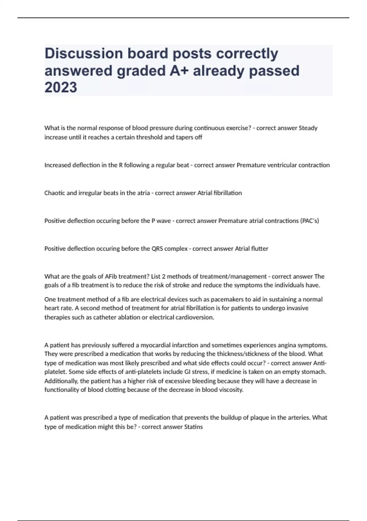 Discussion board posts correctly answered graded A+ already passed 2023 What is the normal response of blood pressure during continuous exercise? - correct answer Steady increase until it reaches a certain threshold and tapers off Increased deflection in the R following a regular beat - correct answer Premature ventricular contraction Chaotic and irregular beats in the atria - correct answer Atrial fibrillation Positive deflection occuring before the P wave - correct answer Premature atrial contractions (PAC's) Positive deflection occuring before the QRS complex - correct answer Atrial flutter What are the goals of AFib treatment? List 2 methods of treatment/management - correct answer The goals of a fib treatment is to reduce the risk of stroke and reduce the symptoms the individuals have. One treatment method of a fib are electrical devices such as pacemakers to aid in sustaining a normal heart rate. A second method of treatment for atrial fibrillation is for patients to undergo invasive therapies such as catheter ablation or electrical cardioversion. A patient has previously suffered a myocardial infarction and sometimes experiences angina symptoms. They were prescribed a medication that works by reducing the thickness/stickness of the blood. What type of medication was most likely prescribed and what side effects could occur? - correct answer Anti-platelet. Some side effects of anti-platelets include GI stress, if medicine is taken on an empty stomach. Additionally, the patient has a higher risk of excessive bleeding because they will have a decrease in functionality of blood clotting because of the decrease in blood viscosity. A patient was prescribed a type of medication that prevents the buildup of plaque in the arteries. What type of medication might this be? - correct answer Statins